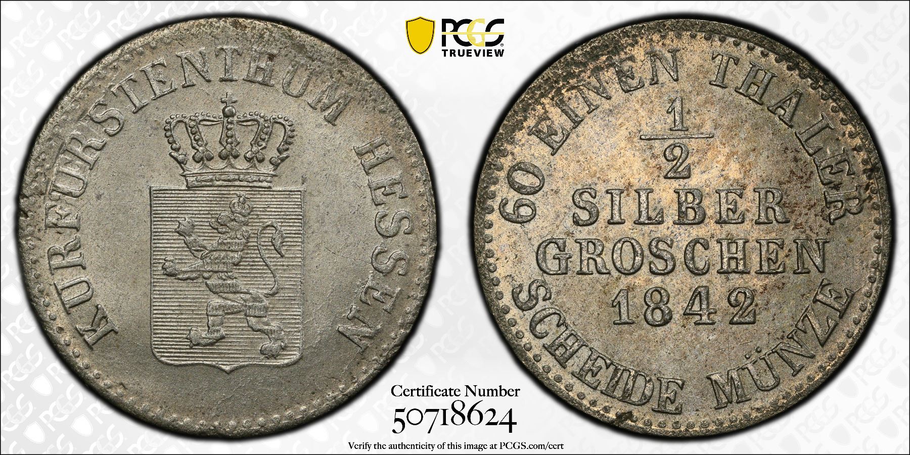 HESSE-CASSEL: Wilhelm II, 1821-1847, BI 1/2 groschen, 1842, PCGS MS64