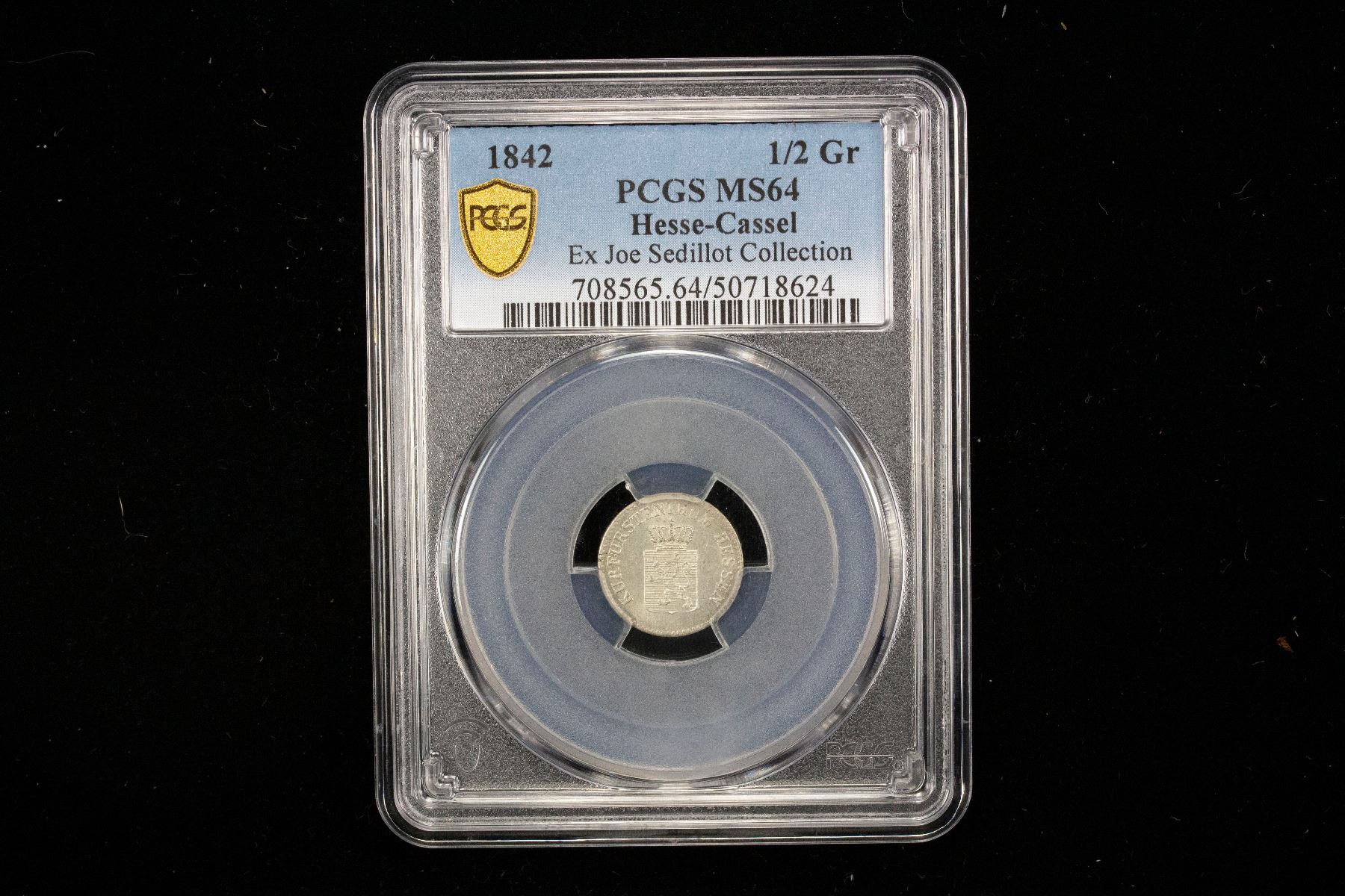 HESSE-CASSEL: Wilhelm II, 1821-1847, BI 1/2 groschen, 1842, KM-603, C-141, a wonderful lustrous mint state example! PCGS graded MS64, ex Joe Sedillot Collection. The Landgraves of Hesse-Cassel (Hesse-Kassel) were famous for renting out their army to other European nations during the 17th and 18th centuries. It was a widespread practice at the time for small countries to rent out troops to larger countries in exchange for subsidies. International jurists drew a distinction between mercenaries and auxiliaries. Mercenaries served in foreign armies as individuals, while auxiliaries were sent by their ruler to the aid of another ruler. Hesse-Kassel took the practice to an extreme, maintaining 5.3% to 7.3% of its population under arms in peacetime in its history, however was known to double that in times of war. The Hessian army served as a readily available reserve for other European nations. During the American Revolutionary War, the Kingdom of Great Britain rented thousands of German troops to fight in the Thirteen Colonies, half of whom came from Hesse-Kassel and nearby Hesse-Hanau. Due to this, American colonists in the colonies referred to all German troops serving with the British with the synecdoche "Hessian".