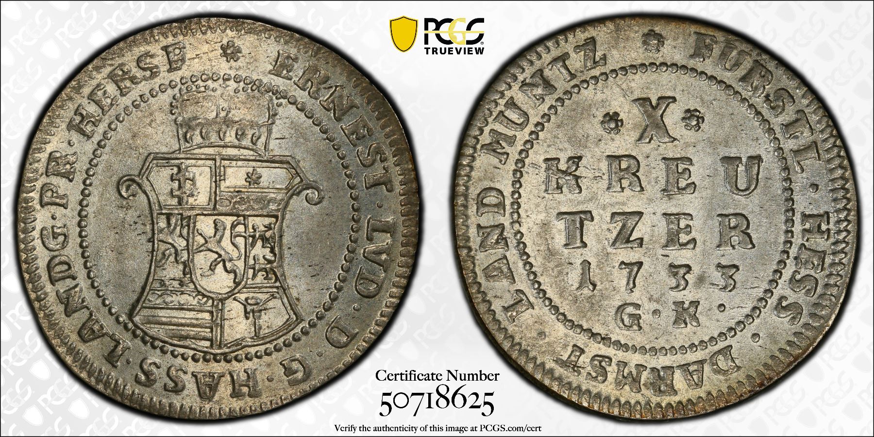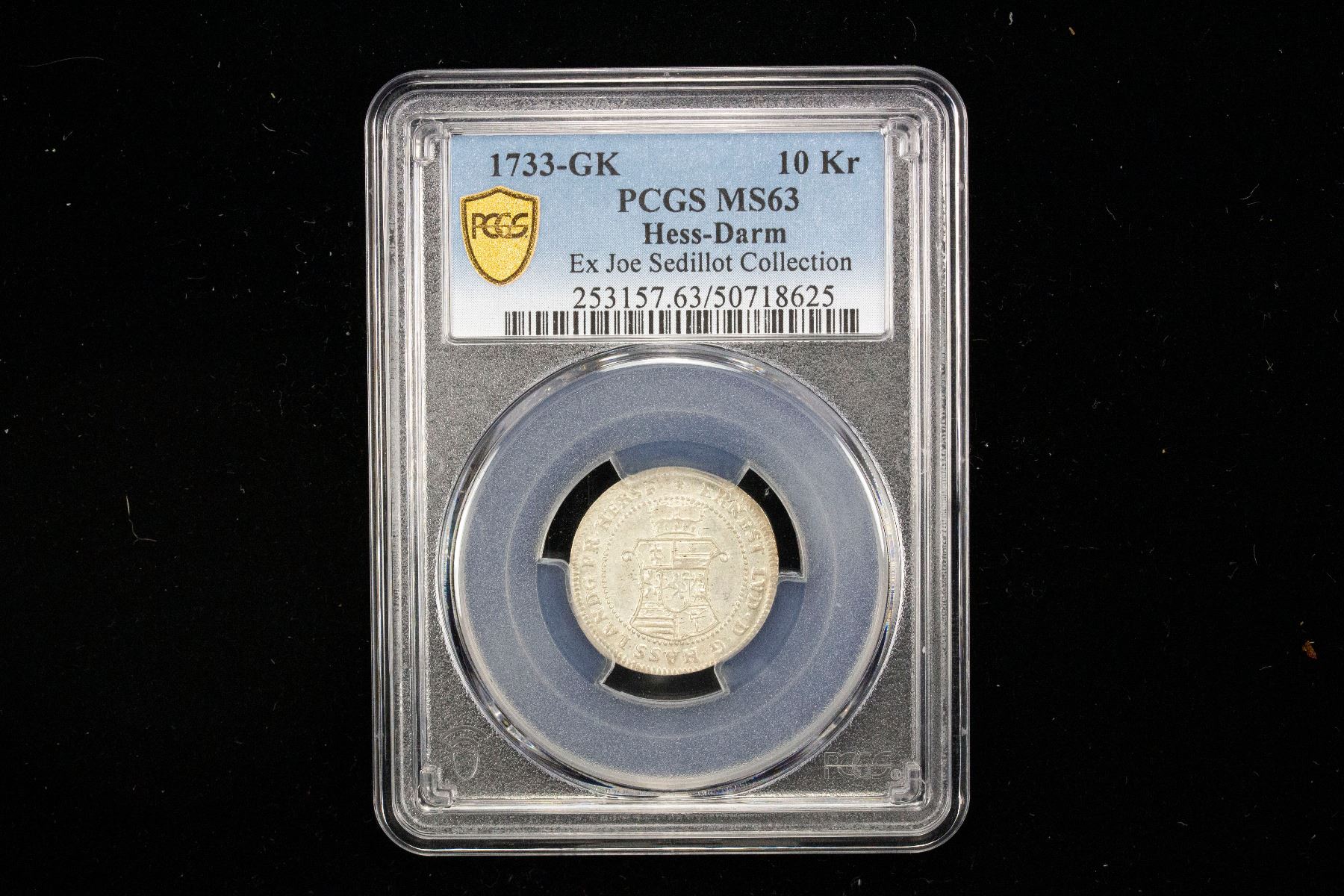 HESSE-DARMSTADT: Ernst Ludwig, 1678-1739, AR 10 kreuzer, 1733, KM-148, mint master's initials GK, a lovely lustrous mint state example, PCGS graded MS63, ex Joe Sedillot Collection. Finest graded 'top pop' by PCGS!Hesse-Darmstadt was a German state, initially a Landgraviate (1567-1806), and then a Grand Duchy (1806-1918), with its capital in Darmstadt. It was formed in the division of old Hesse and later became known simply as Hesse after Hesse-Kassel was absorbed by Prussia.