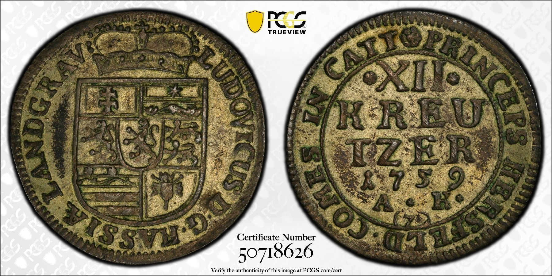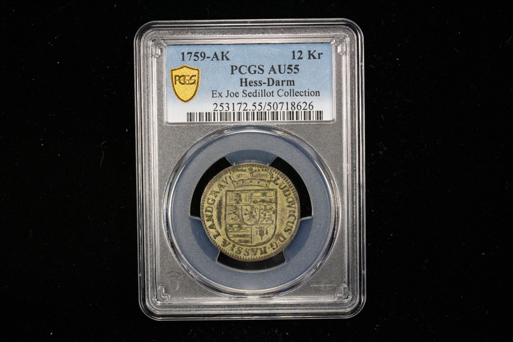 HESSE-DARMSTADT: Louis VIII, 1739-1768, AR 12 kreuzer, 1759, KM-178, C-21, mint master's initials AK, a well struck lustrous example, PCGS graded AU55, ex Joe Sedillot Collection. Finest graded 'top pop' by PCGS!Hesse-Darmstadt was a German state, initially a Landgraviate (1567-1806), and then a Grand Duchy (1806-1918), with its capital in Darmstadt. It was formed in the division of old Hesse and later became known simply as Hesse after Hesse-Kassel was absorbed by Prussia.