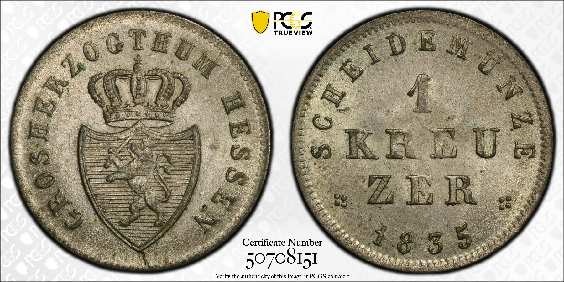 HESSE-DARMSTADT: Ludwig II, 1830-1848, AR kreuzer, 1835, PCGS MS65