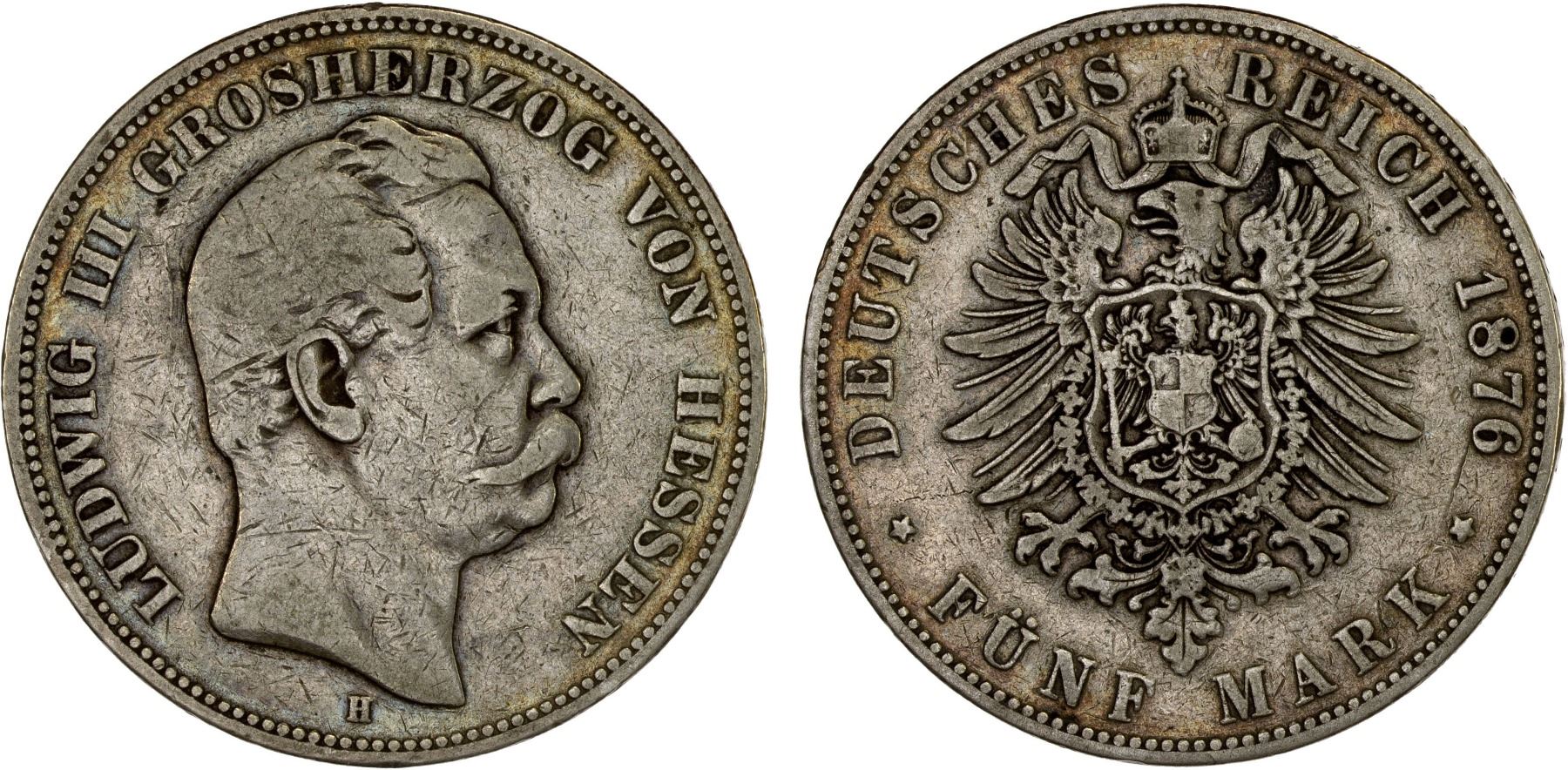 HESSE-DARMSTADT: Ludwig III, 1848-1877, AR 5 mark, 1876-H, Fine