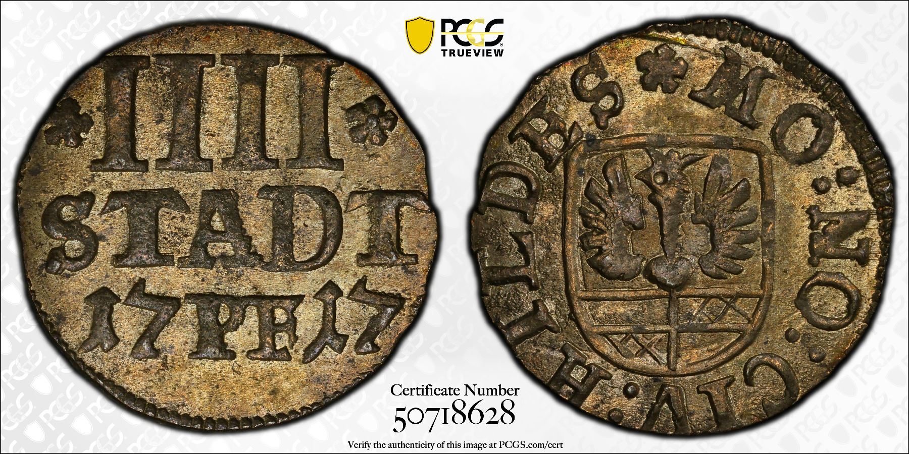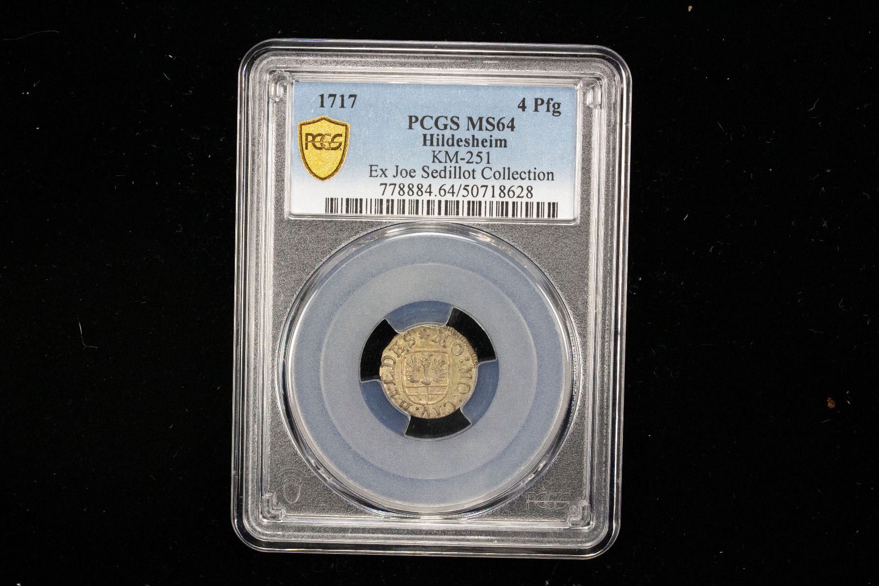 HILDESHEIM: Free Imperial City, BI 4 pfennig, 1717, KM-251, a wonderful lustrous argent mint state example! PCGS graded MS64, ex Joe Sedillot Collection. The Holy Roman Emperor Louis the Pious founded the Bishopric of Hildesheim in 815 and created the first settlement with a chapel on the (Domhügel) Cathedral Hill. According to tradition, the city was named after its founder Hildwin. The city is one of the oldest cities in Northern Germany.