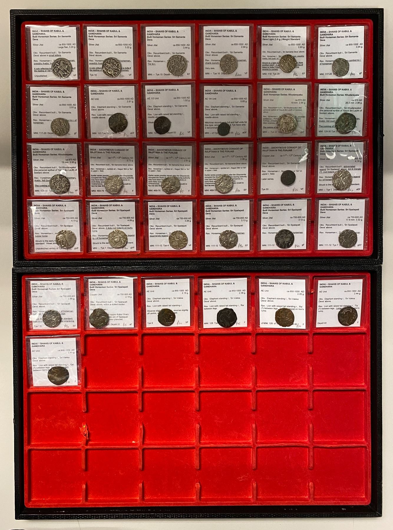 HINDUSHAHI: LOT of 21 silver and 10 copper coins, including Spalapati Deva (8 silver & 1 copper); Vakka Deva (3 copper); Samanta Deva (7 silver and 3 copper); Khudarayaka (3 silver, including one with Arabic 'adl on the reverse upper right); and Samanta Deva in Rajputana (3 silver and 1 copper); silver all VF or slightly better, copper average Fine; all with Todd's full description; retail value $650, lot of 31 pieces, ex Ian Todd Collection.