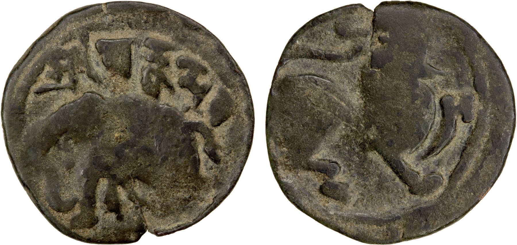 HINDUSHAHI: Vakka Deva, 9th/10th century, AE jital (2.45g), Tye-9, elephant left, ruler's name above // lion right, forepaw raised, excellent style, VF.