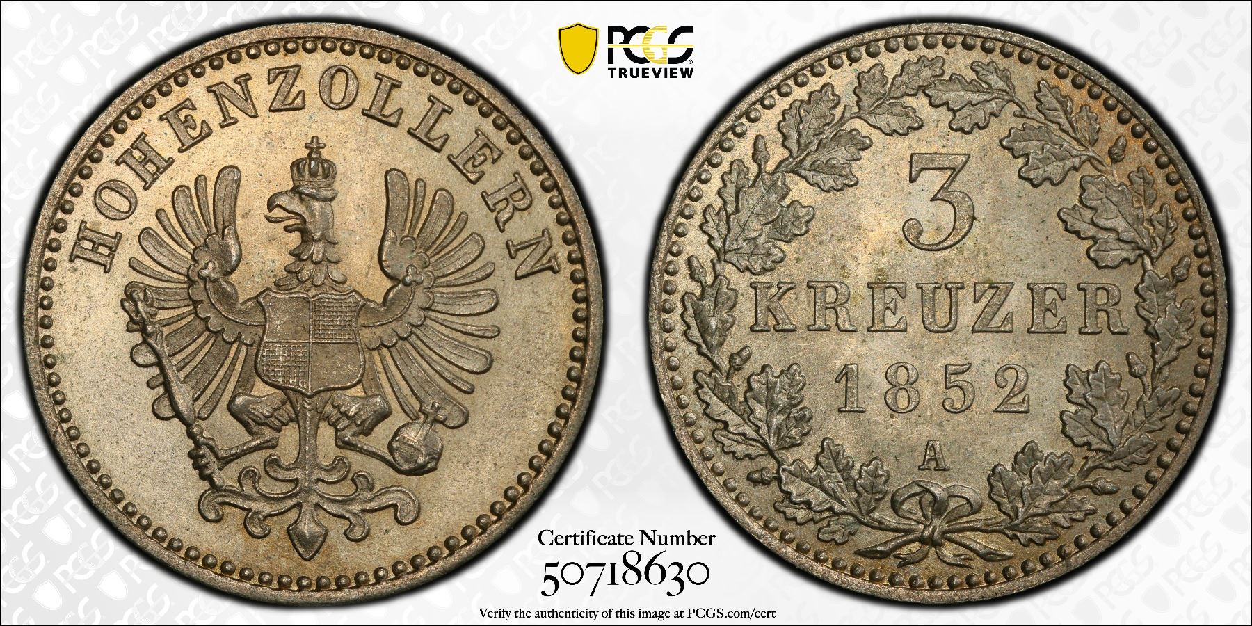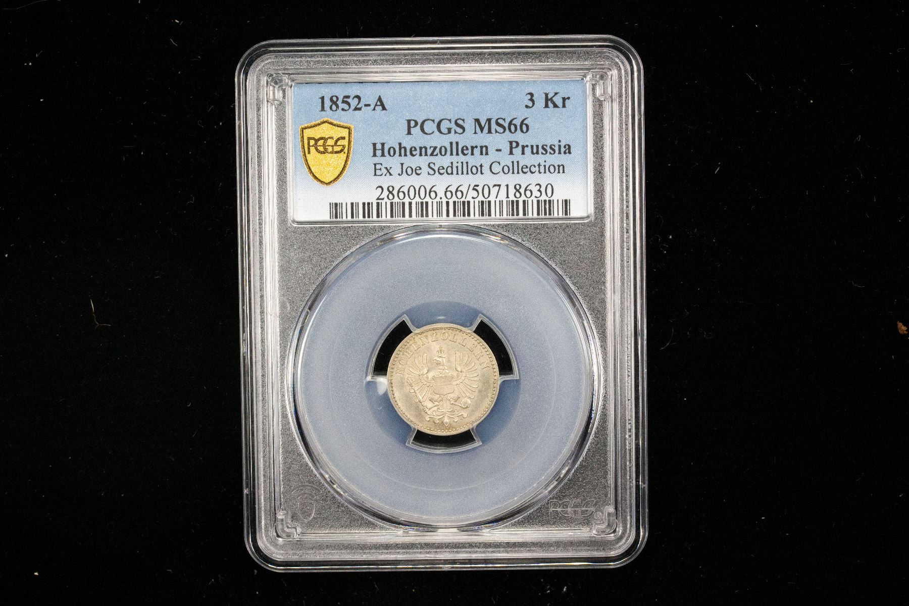HOHENZOLLERN: Friedrich Wilhelm IV, 1840-1861, BI 3 kreuzer, 1852-A, KM-2, a fantastic lustrous well struck mint state example! PCGS graded MS66, ex Joe Sedillot Collection. The Province of Hohenzollern was a district of Prussia from 1850 to 1946.Frederick William IV had an artistic nature and an interest in architecture. He extended the building ensembles of the Berlin-Potsdam Residence Landscape, Museum Island, and the cultural landscape of the Upper Middle Rhine Valley, and he supported the completion of the Cologne Cathedral. All are now UNESCO World Heritage Sites.