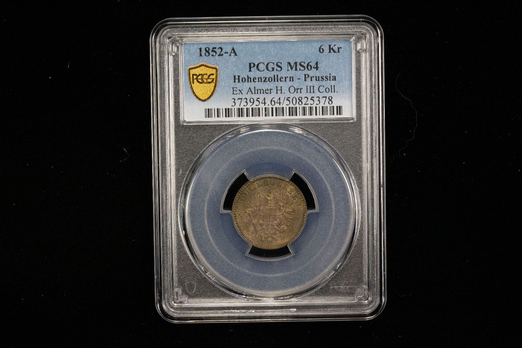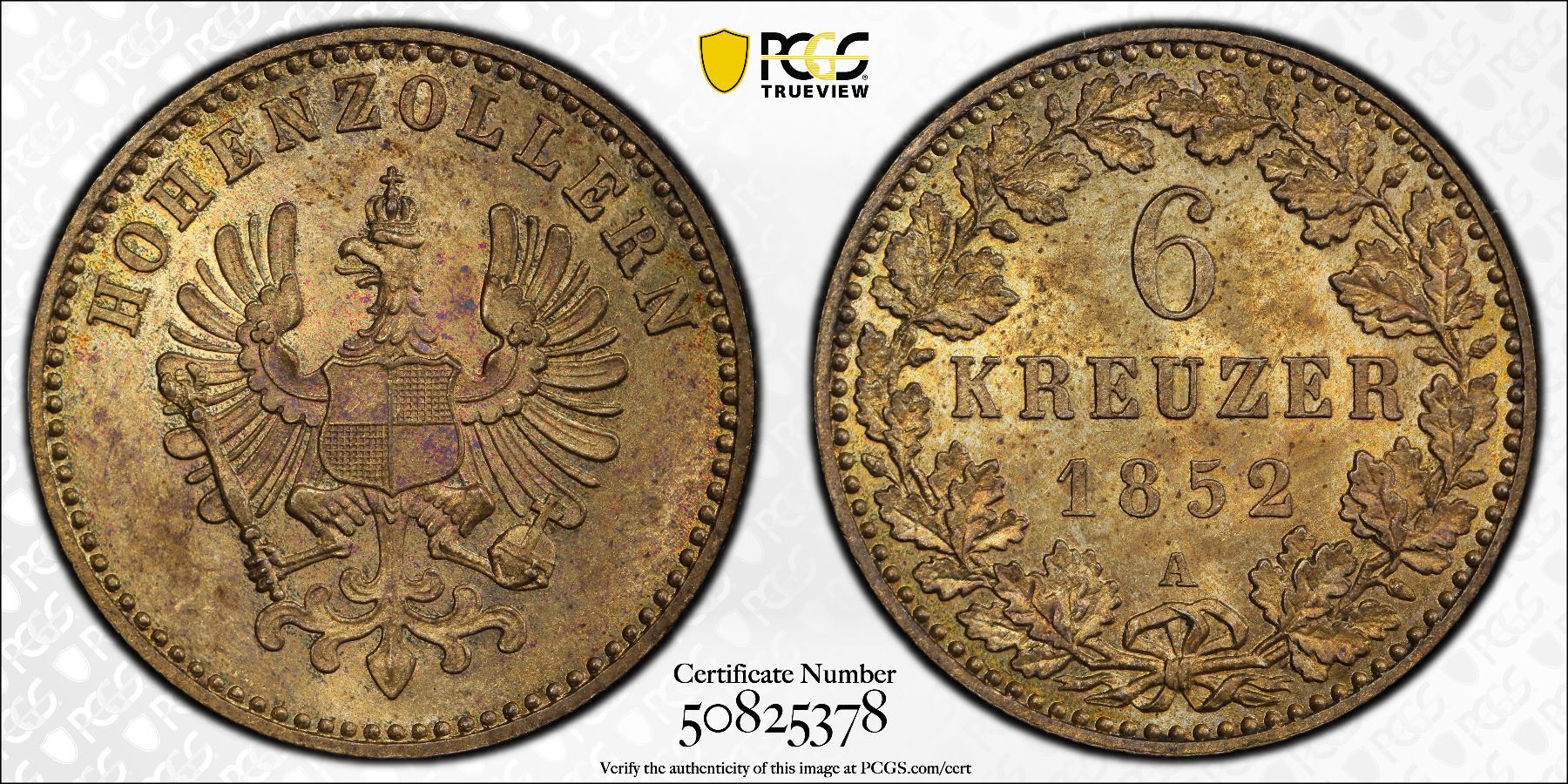 HOHENZOLLERN: Friedrich Wilhelm IV, 1840-1861, BI 6 kreuzer, 1852-A, KM-3, a wonderful lustrous mint state example! PCGS graded MS64, ex Almer H. Orr III Collection. The Province of Hohenzollern was a district of Prussia from 1850 to 1946.Frederick William IV had an artistic nature and an interest in architecture. He extended the building ensembles of the Berlin-Potsdam Residence Landscape, Museum Island, and the cultural landscape of the Upper Middle Rhine Valley, and he supported the completion of the Cologne Cathedral. All are now UNESCO World Heritage Sites.
