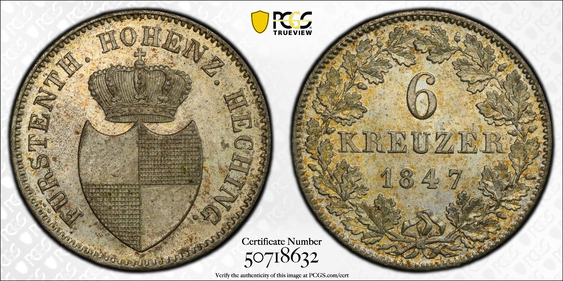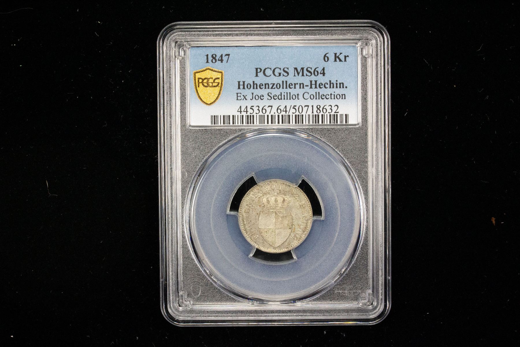 HOHENZOLLERN-HECHINGEN: Friedrich Wilhelm Konstantin, 1838-1849, BI 6 kreuzer, 1847, KM-45, C-4, a wonderful lustrous mint state example, PCGS graded MS64, ex Joe Sedillot Collection. Finest graded 'top pop' by PCGS!Constantine (Konstantin) served as regent for his ill father, Frederick, beginning in 1834. Upon his father's death in 1838, Constantine became Prince of Hohenzollern-Hechingen and after the death of his mother in 1845, he also inherited the Duchy of Sagan. Following the Revolutions of 1848, Constantine and Charles Anthony, Prince of Hohenzollern-Sigmaringen both agreed to cede their principalities to the Kingdom of Prussia and renounced their rights as sovereign princes and heads of government on 7 December 1849.