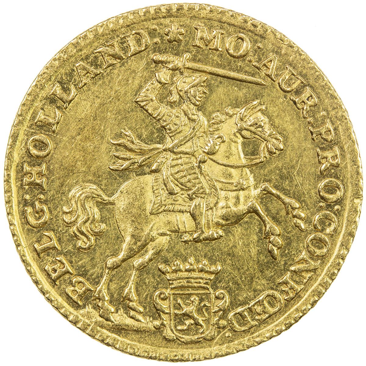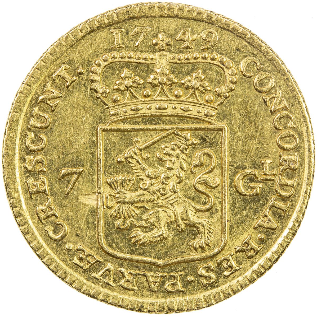 HOLLAND: Dutch Republic, AV 7 gulden, 1749, KM-96, armored knight riding horse brandishing sword, crowned shield below, MO: AUR: PRO: CONFOED: BELG: HOLLAND: // crowned shield with Holland arms, date split above, denomination above privy marks in fields, CONCORDIA RES PARVAE CRESCUNT, dots between legend, About Unc.