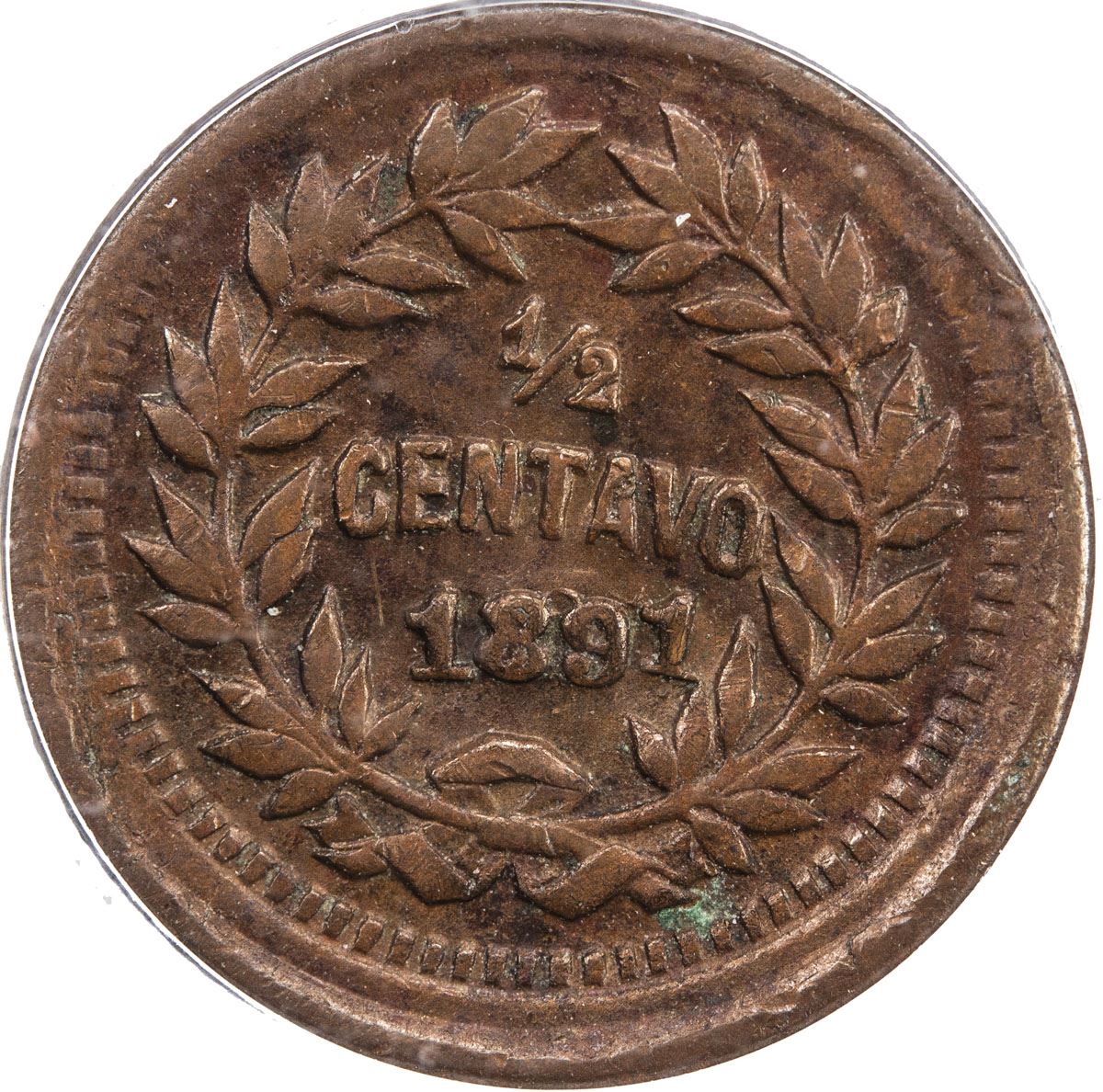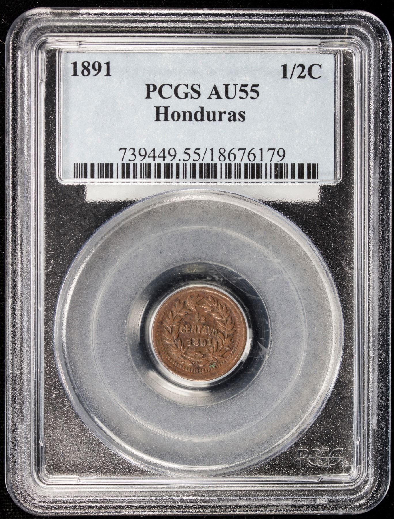 HONDURAS: Republic, AE ½ centavo, 1891, KM-45, rare date, well struck, last "1" in date high and slightly tilted right, brown, PCGS graded AU55, RRR. The consignor states that this piece is one of five known. The only record we could find of previous sales is Lot 25098 in Heritage sale 3015 (Long Beach, September 2011). The piece in our auction may be the finest known.
