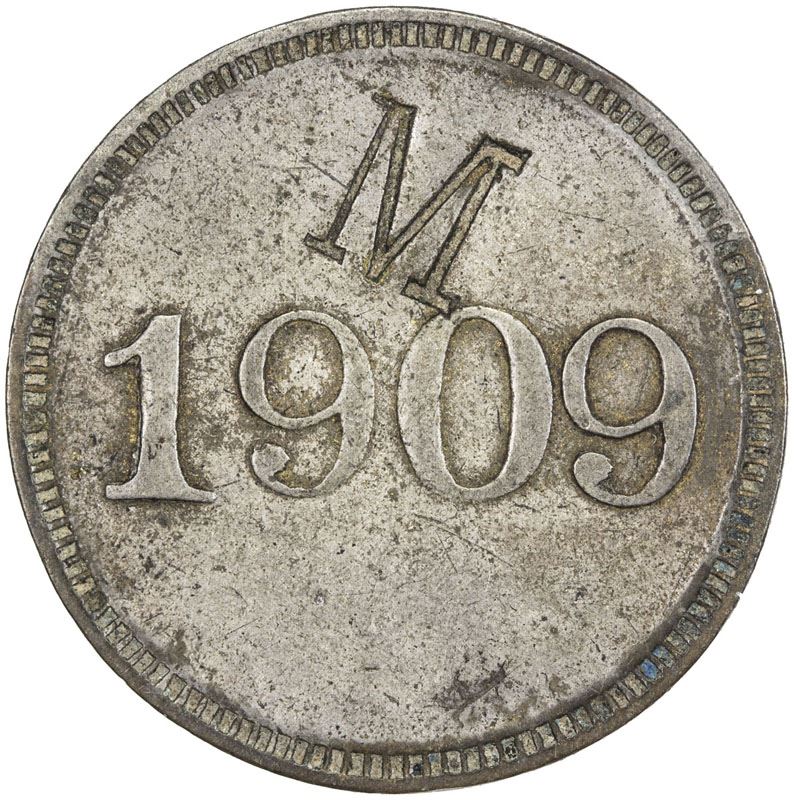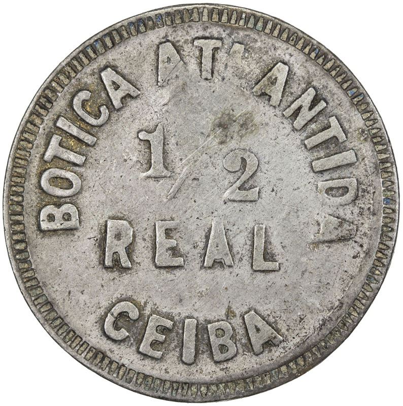 HONDURAS: copper-nickel ½ real token, 1909, Rulau-Atl 50, Ceiba, Botica Atlantida, with countermark M on reverse, VF, RR.