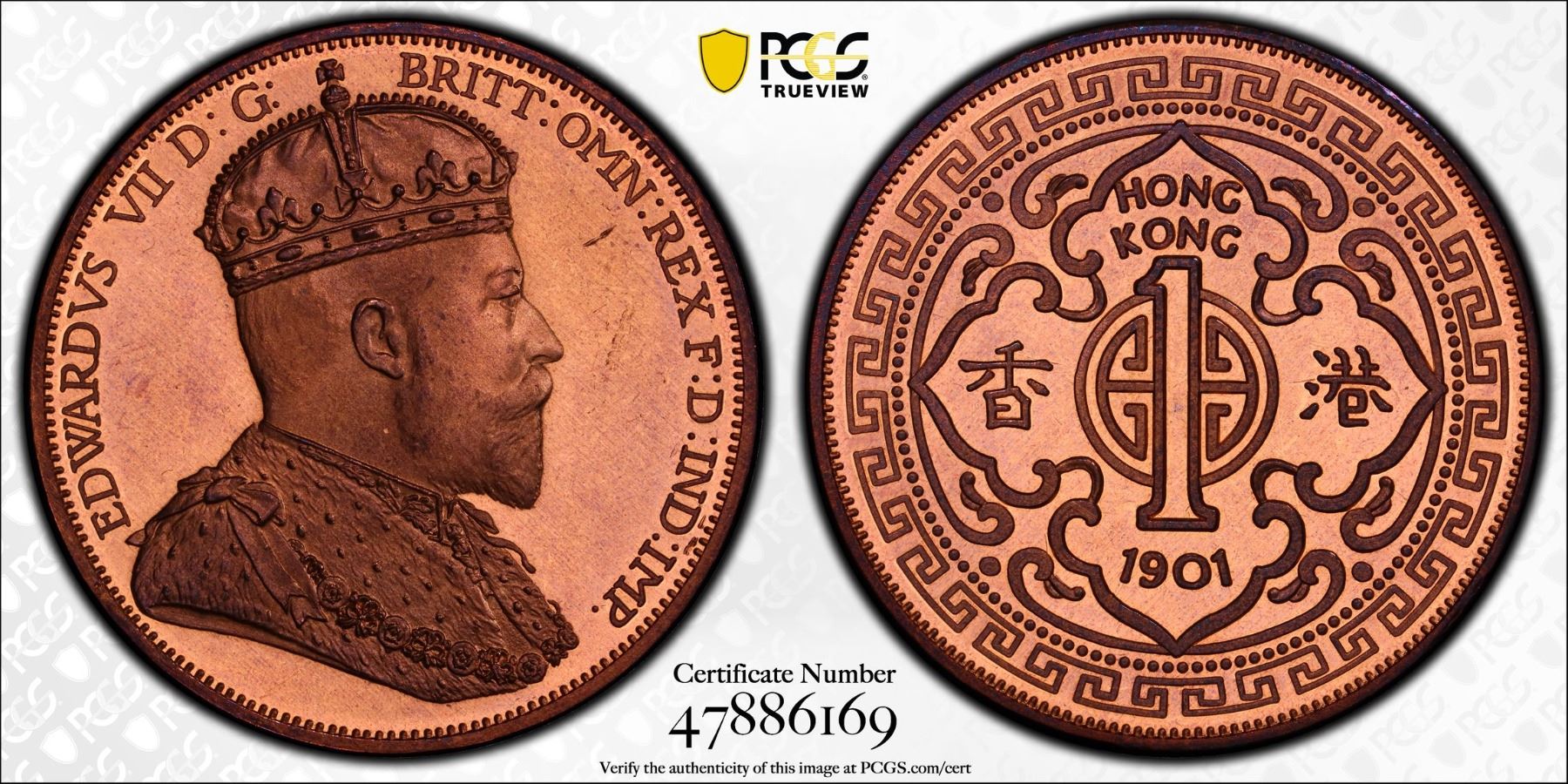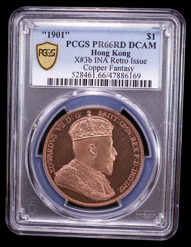 HONG KONG: Fantasy Issues, 1 dollar, "1901", KM-X3b, INA Retro Fantasy Edward VII type, struck in copper, International Numismatic Agency(INA) issue, PCGS graded PF66 Red Cameo. The International Numismatic Agency (INA) struck high quality fantasy British crown coins primarily around 2000–2001, with additional, subsequent strikings reported in 2007 and 2008. These coins are often referred to as "INA Retro Fantasy Issues."