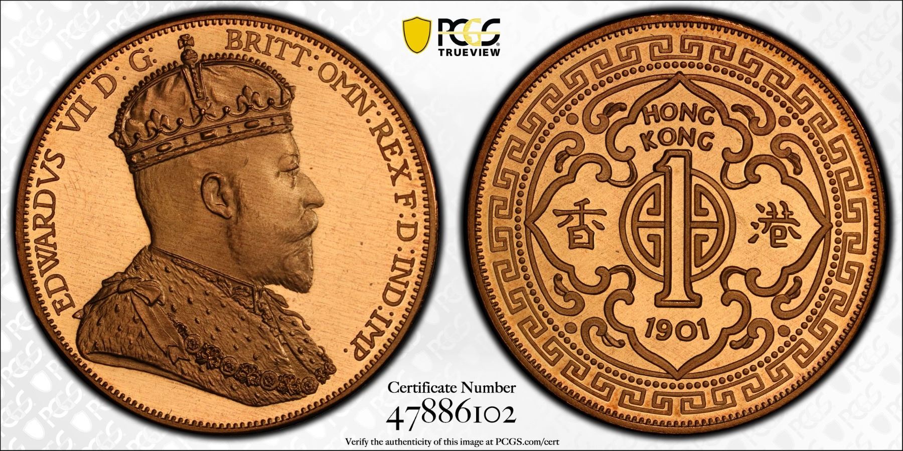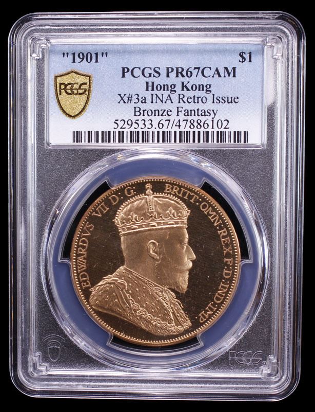 HONG KONG: Fantasy Issues, 1 dollar, "1901", KM-X3a, INA Retro Fantasy Edward VII type, struck in bronze, International Numismatic Agency(INA) issue, PCGS graded PF67 Cameo. The International Numismatic Agency (INA) struck high quality fantasy British crown coins primarily around 2000–2001, with additional, subsequent strikings reported in 2007 and 2008. These coins are often referred to as "INA Retro Fantasy Issues."