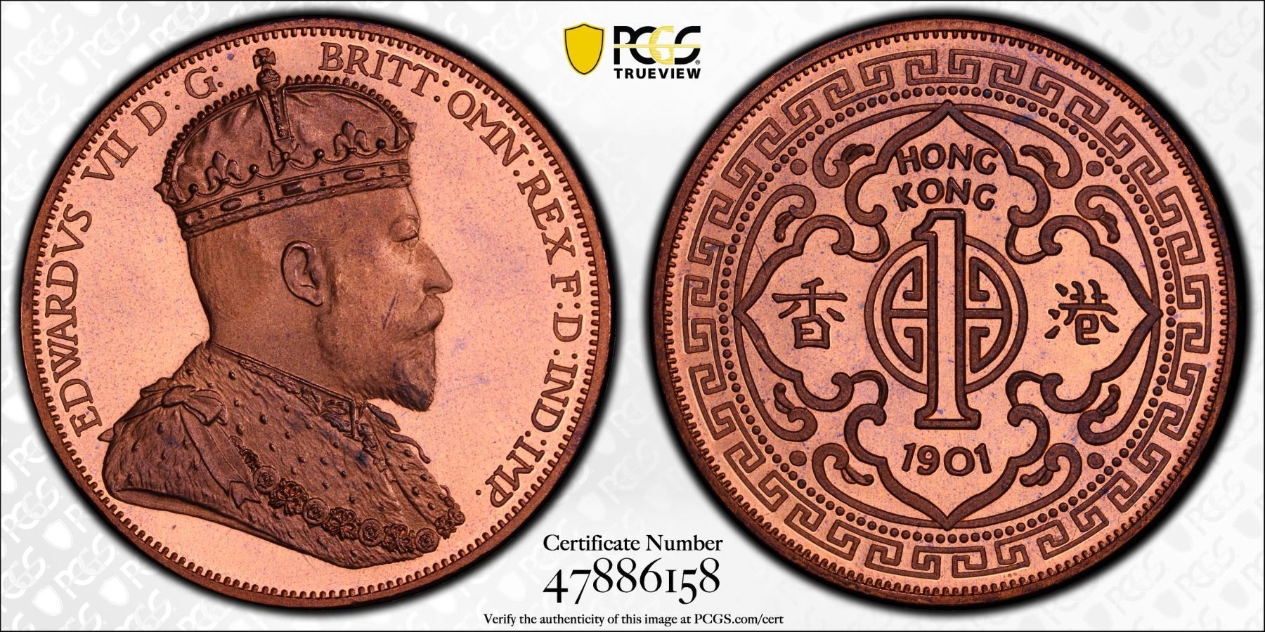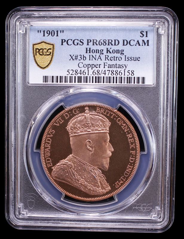 HONG KONG: Fantasy Issues, 1 dollar, "1901", KM-X3b, INA Retro Fantasy Edward VII type, struck in copper, International Numismatic Agency(INA) issue, PCGS graded PF68 Red Cameo. The International Numismatic Agency (INA) struck high quality fantasy British crown coins primarily around 2000–2001, with additional, subsequent strikings reported in 2007 and 2008. These coins are often referred to as "INA Retro Fantasy Issues."