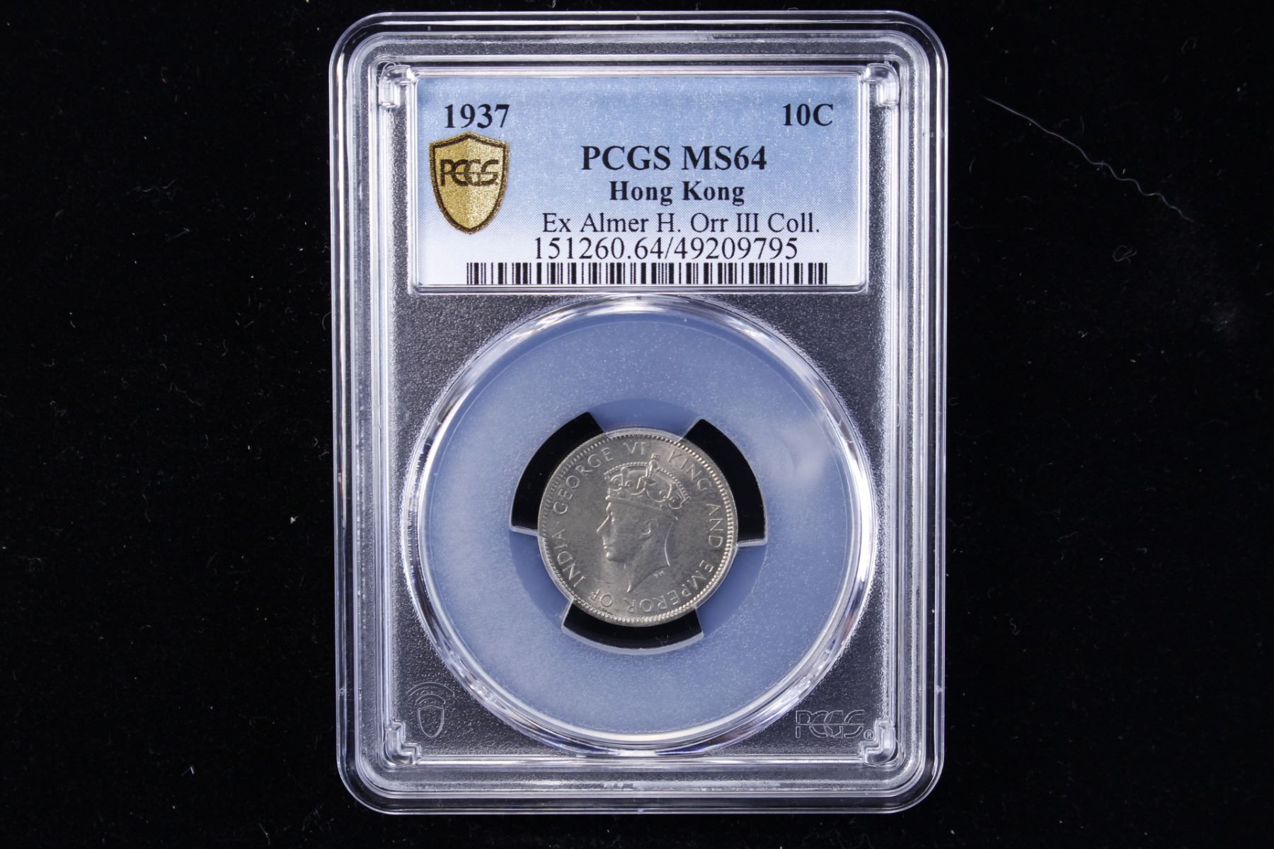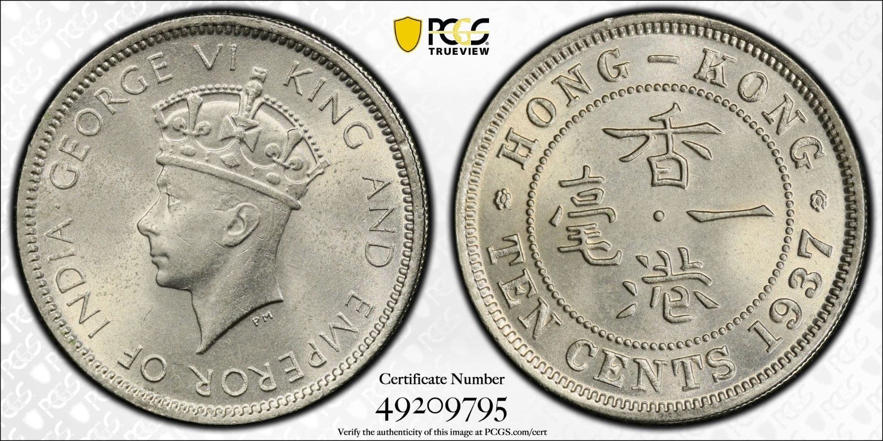 HONG KONG: George VI, 1936-1952, AR 10 cents, 1937, Y-21, a wonderful lustrous example! MS64, ex Almer H. Orr III Collection.