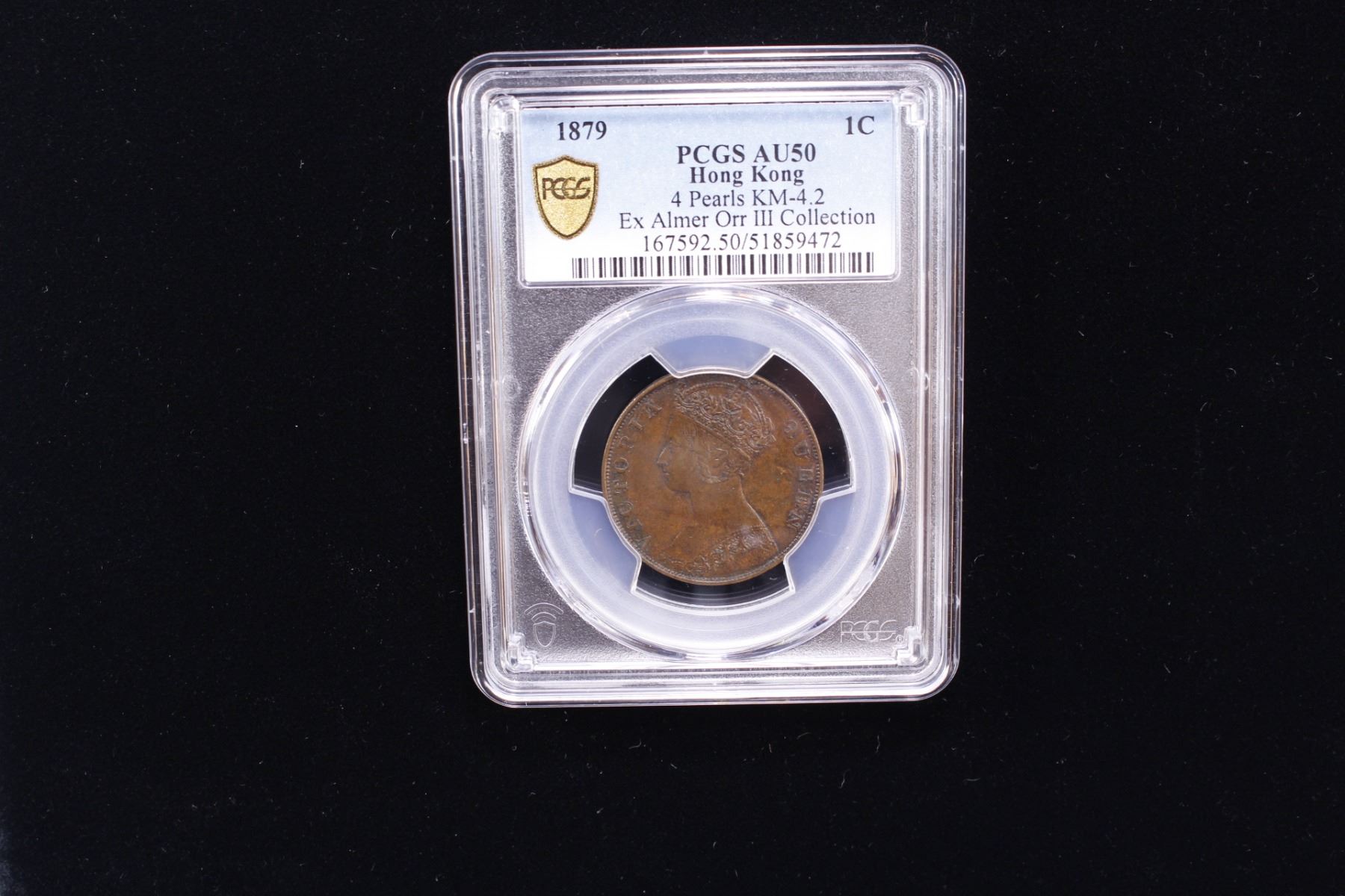 HONG KONG: Victoria, 1841-1901, AE cent, 1879, KM-4.2, Y-2.1, 4 pearls variety, PCGS graded AU50, ex Almer H. Orr III Collection.