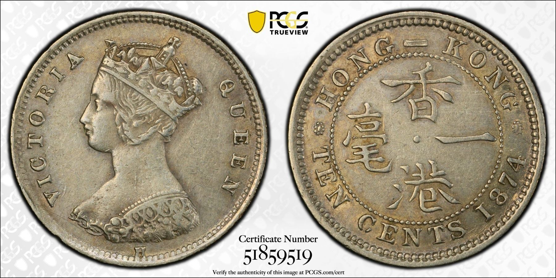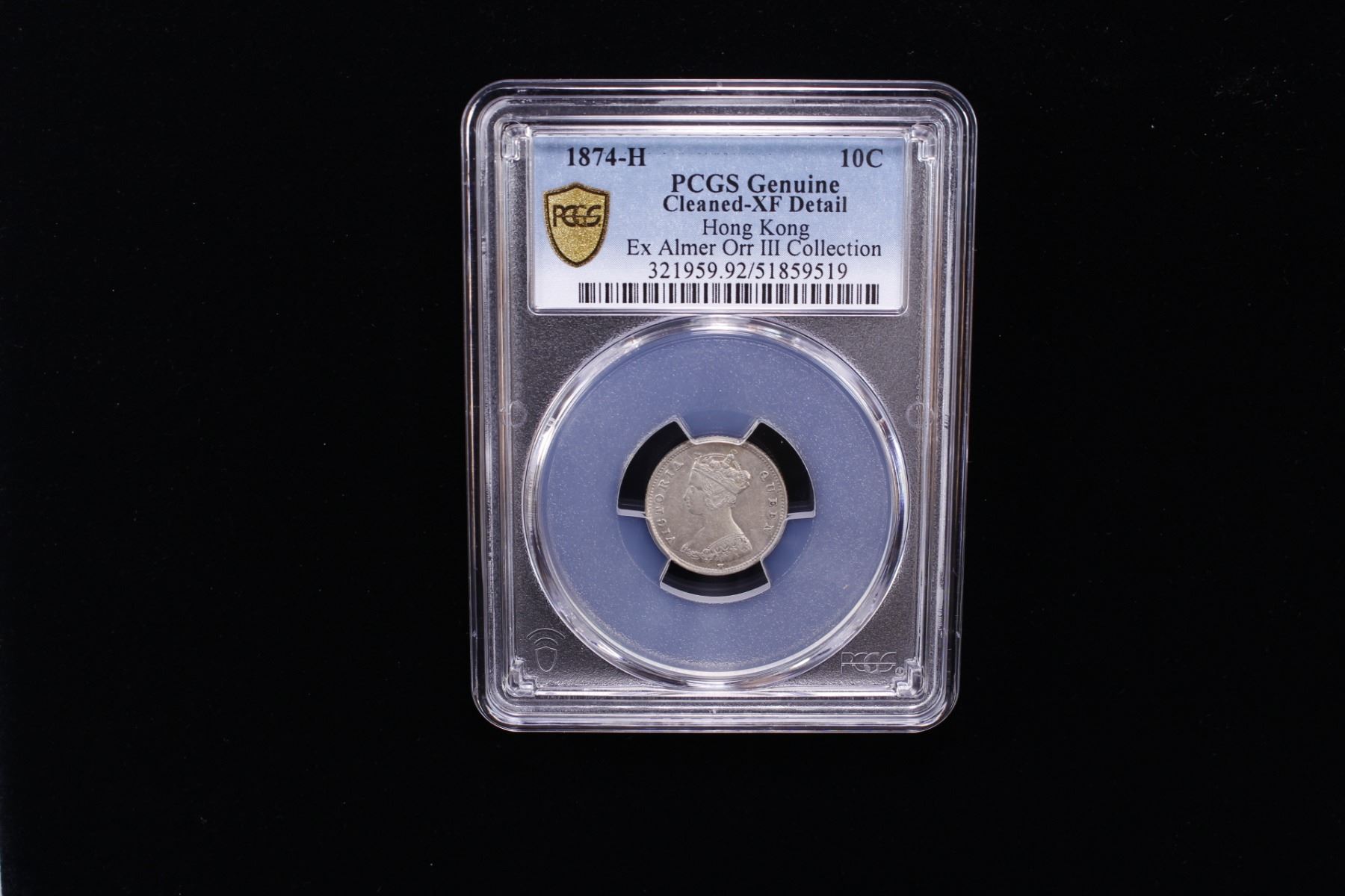 HONG KONG: Victoria, 1841-1901, AR 10 cents, Heaton, 1874-H, KM-6, once cleaned, PCGS graded XF details, ex Almer H. Orr III Collection.