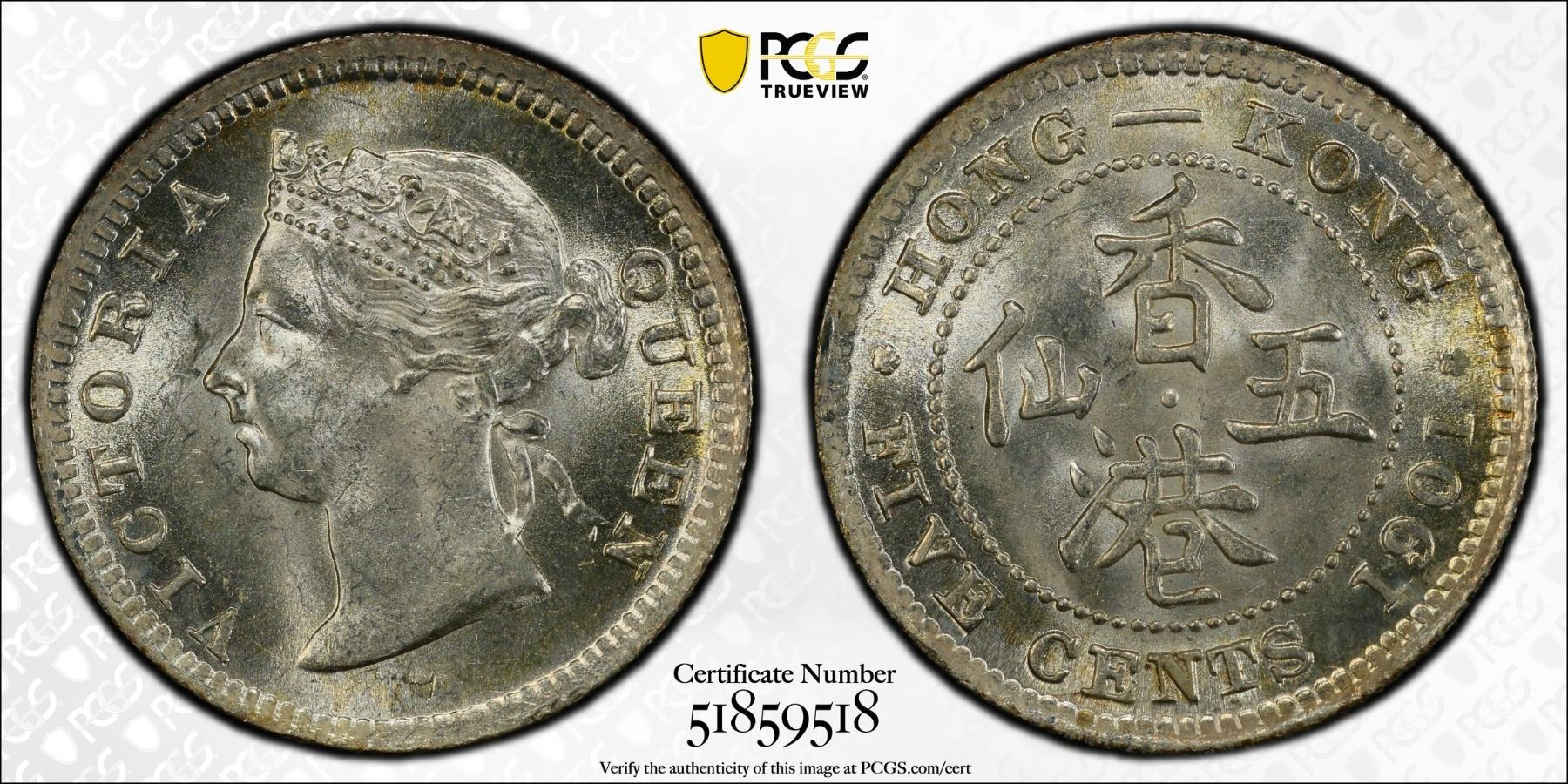 HONG KONG: Victoria, 1841-1901, AR 5 cents, 1901, KM-5, a lovely example, PCGS graded MS63, ex Almer H. Orr III Collection.