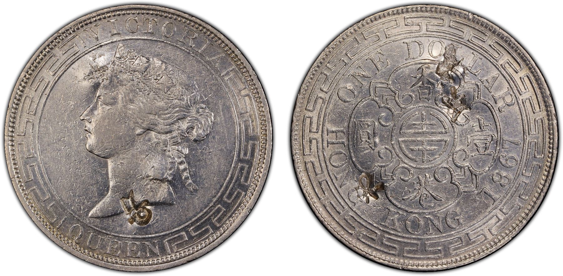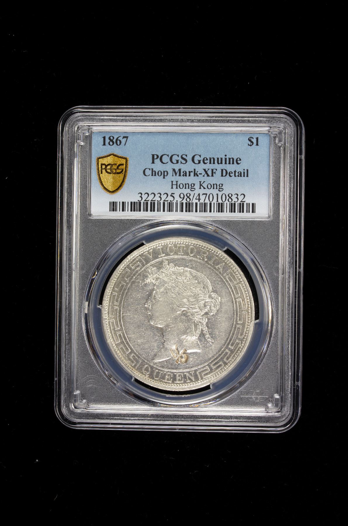HONG KONG: Victoria, 1841-1901, AR dollar, 1867, KM-10, with a few large Chinese merchant chopmarks, PCGS graded XF details.