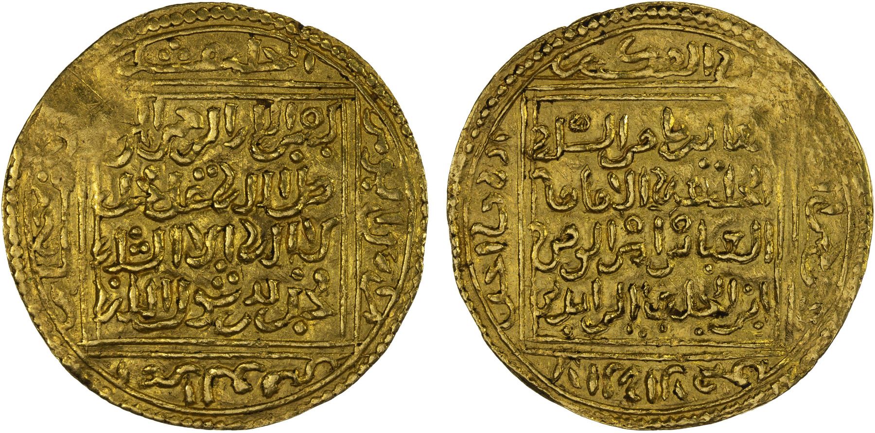 HUDID OF MURCIA: temp. al-Mutawakkil Muhammad, 1224-1237, AV dinar (4.51g), NM, ND, A-N4257, totally anonymous, but with reference to the Abbasid caliphate (without the caliph's name), which confirms the attribution to the Hudids; North African style with 4-line legends within a square-in-circle design on both sides, VF, RRR. There are only 3 examples filed on CoinArchives.