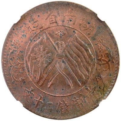 HUNAN: AE 20 cash, ND (1919), Y-400.5, crossed Five-colored and Wuchang Uprising flags, lamination split error, NGC graded MS63 BR.