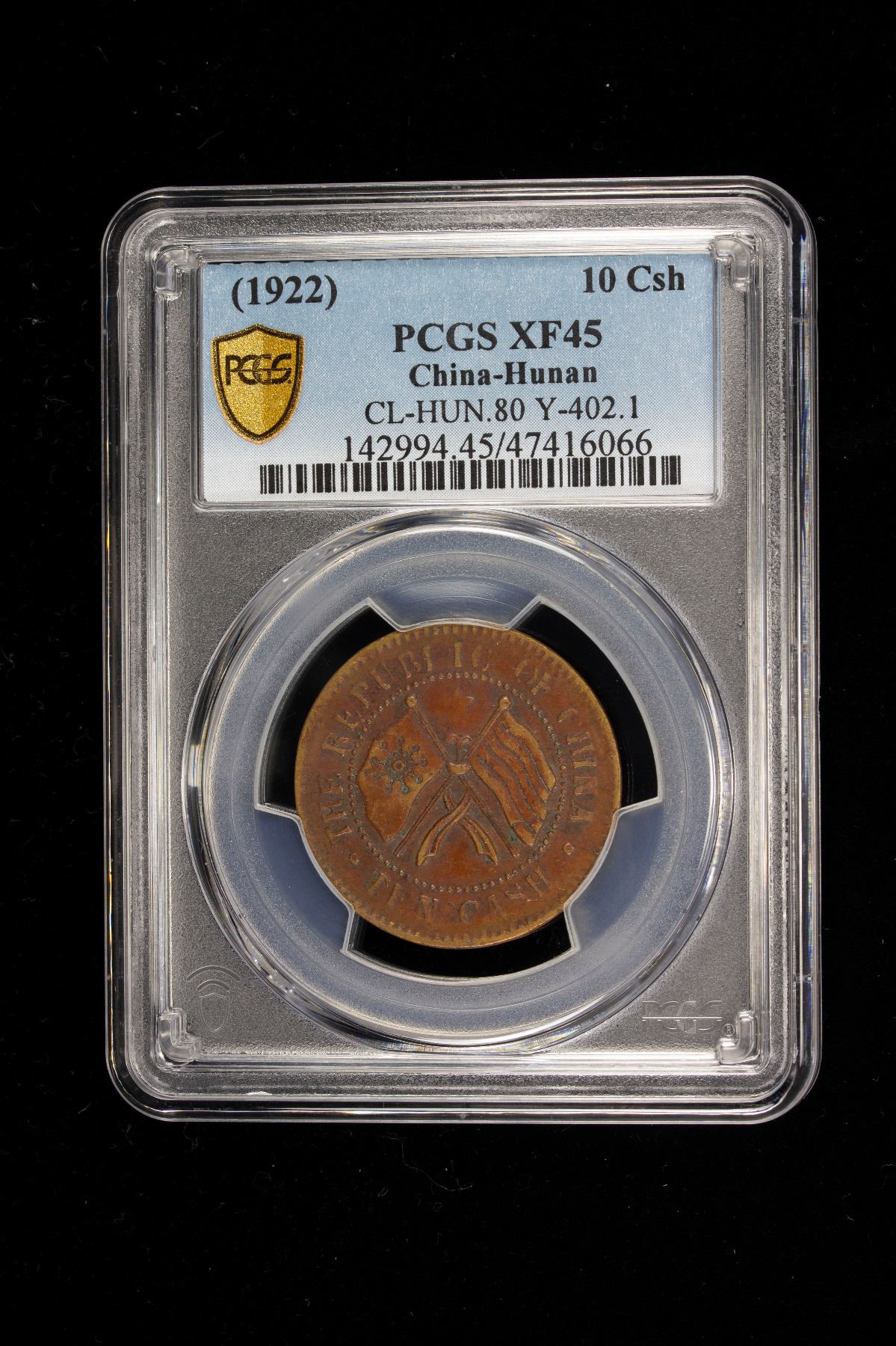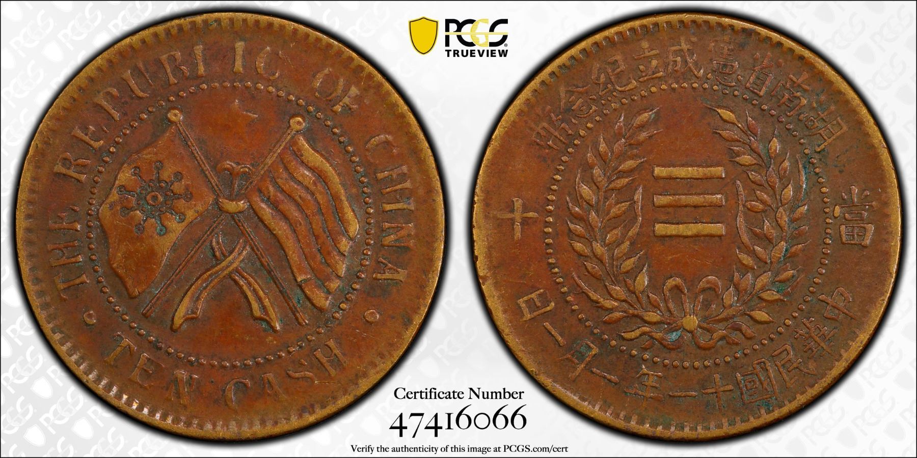 HUNAN: Republic, AE 10 cash, year 11 (1922), Y-402.1, CL-HUN.80, Provincial Constitution Commemorative, crossed Wuchang Uprising and Five-colored flags, star above, PCGS graded XF45.