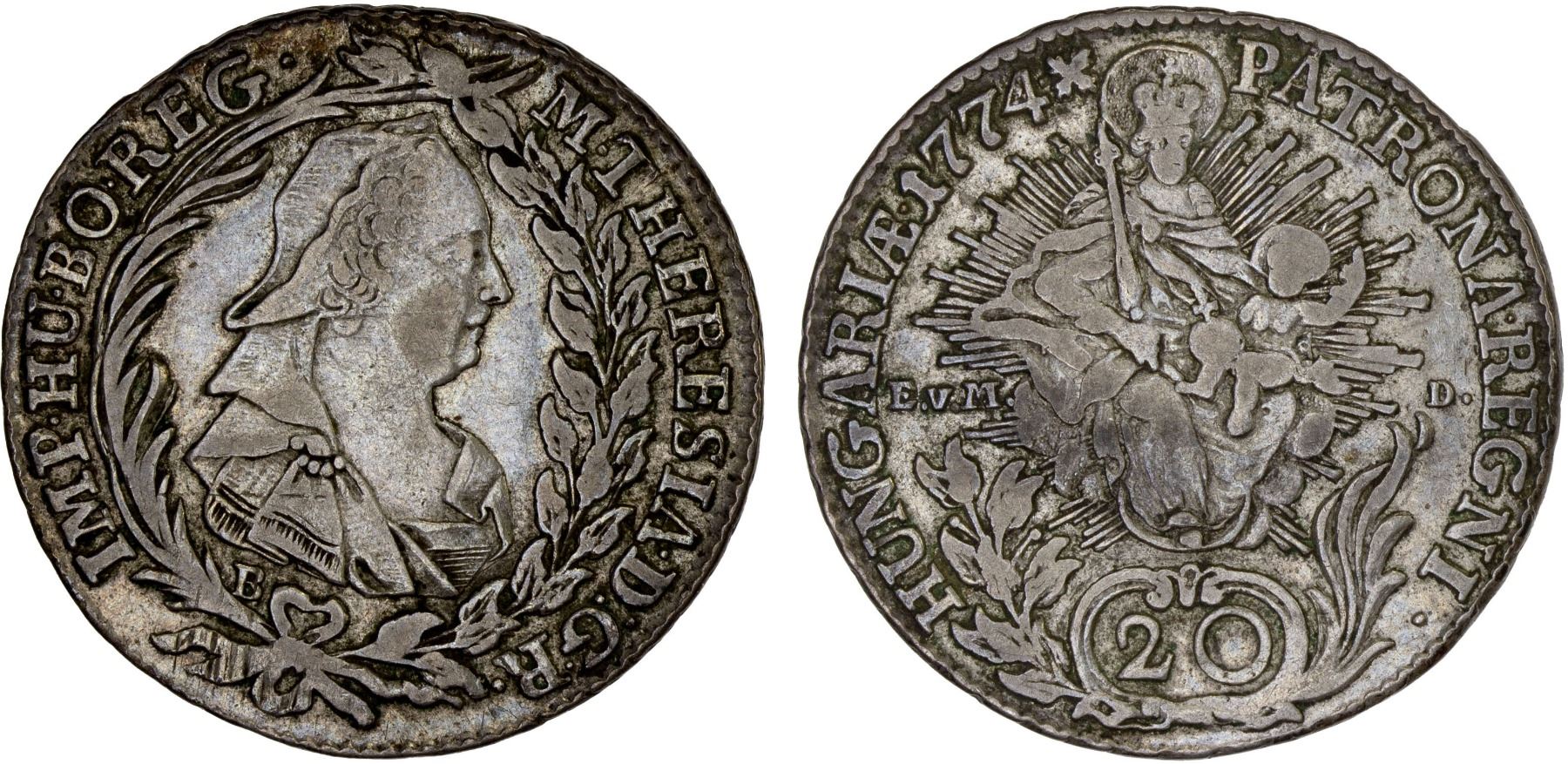 HUNGARY: AR 20 krajczar, 1774-B, KM-381.1, initials EVM-D, VF.