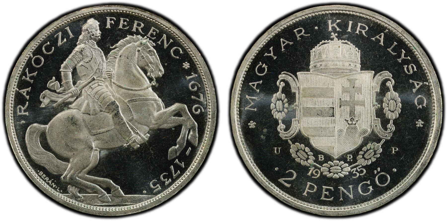 HUNGARY: Artex Restrikes, AR 2 pengo, "1935", KM-XPn11.1, restrike of the Miklós Horthy (1920-1944) issue, 200th Death Anniversary - Prince Francis II Rákóczi medallic issue, Artex restrike circa 1963-65 with initials UP, a fantastic example, PCGS graded PF66 Deep Cameo. Artex was a company owned and operated by the Hungarian mint for producing restrikes of classic Hungarian coins in the mid 1960s. Restrikes of dozens of coins were produced, including patterns and klippes, and the quality of the restrikes were excellent. Most had 1,000 pieces struck, but some had very few (even in the single digits) or up to several thousand struck. There are several ways of identifying an Artex restrike. For smaller coins, most have a rosette added either on the obverse before the legend for silver, or for base metal coins, on the reverse below the mintmark or above the denomination. For larger coins, most have a UP somewhere, usually near the mint mark.