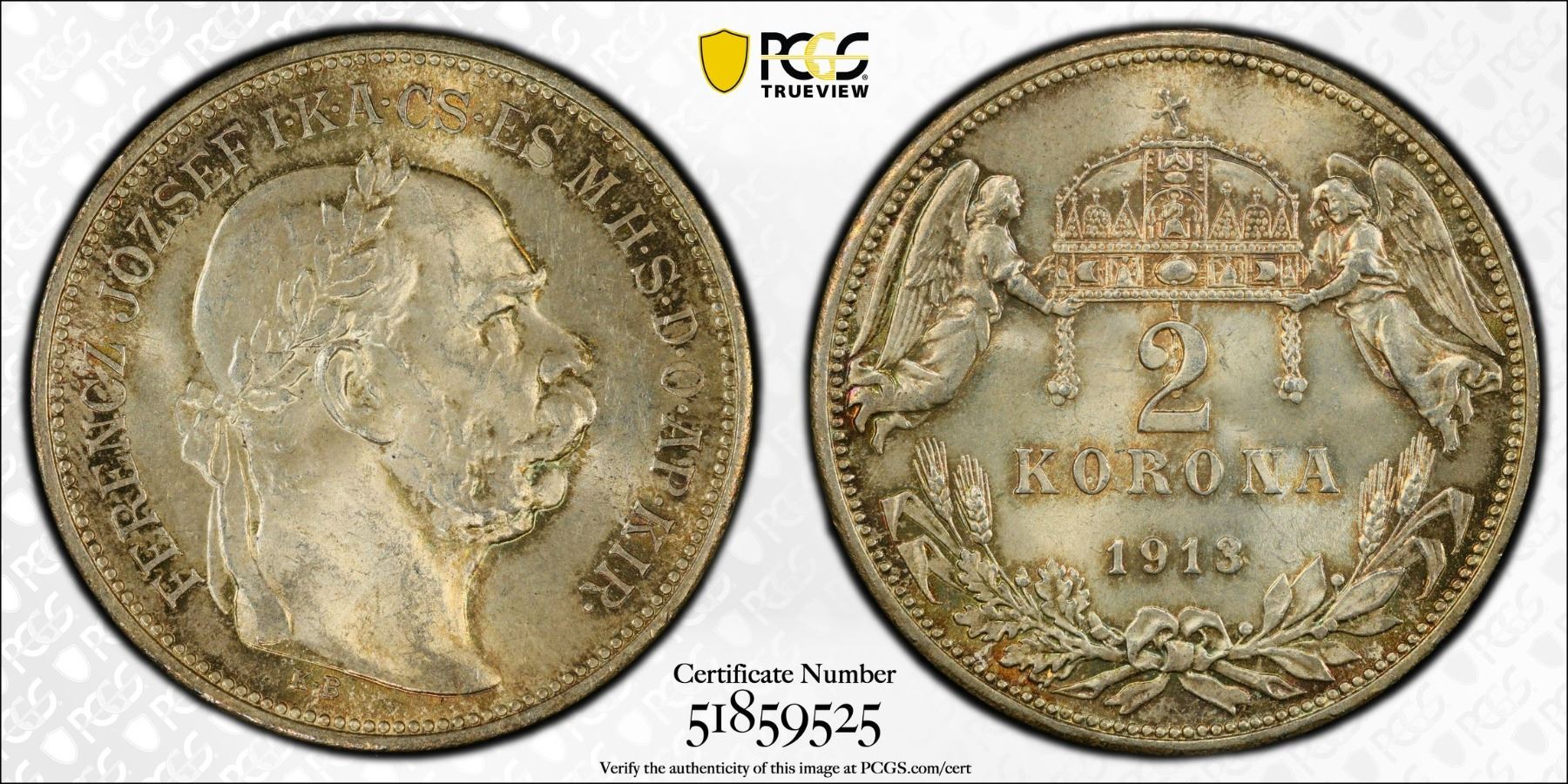 HUNGARY: Franz Joseph I, 1848-1916, AR 2 corona, 1913, PCGS MS65
