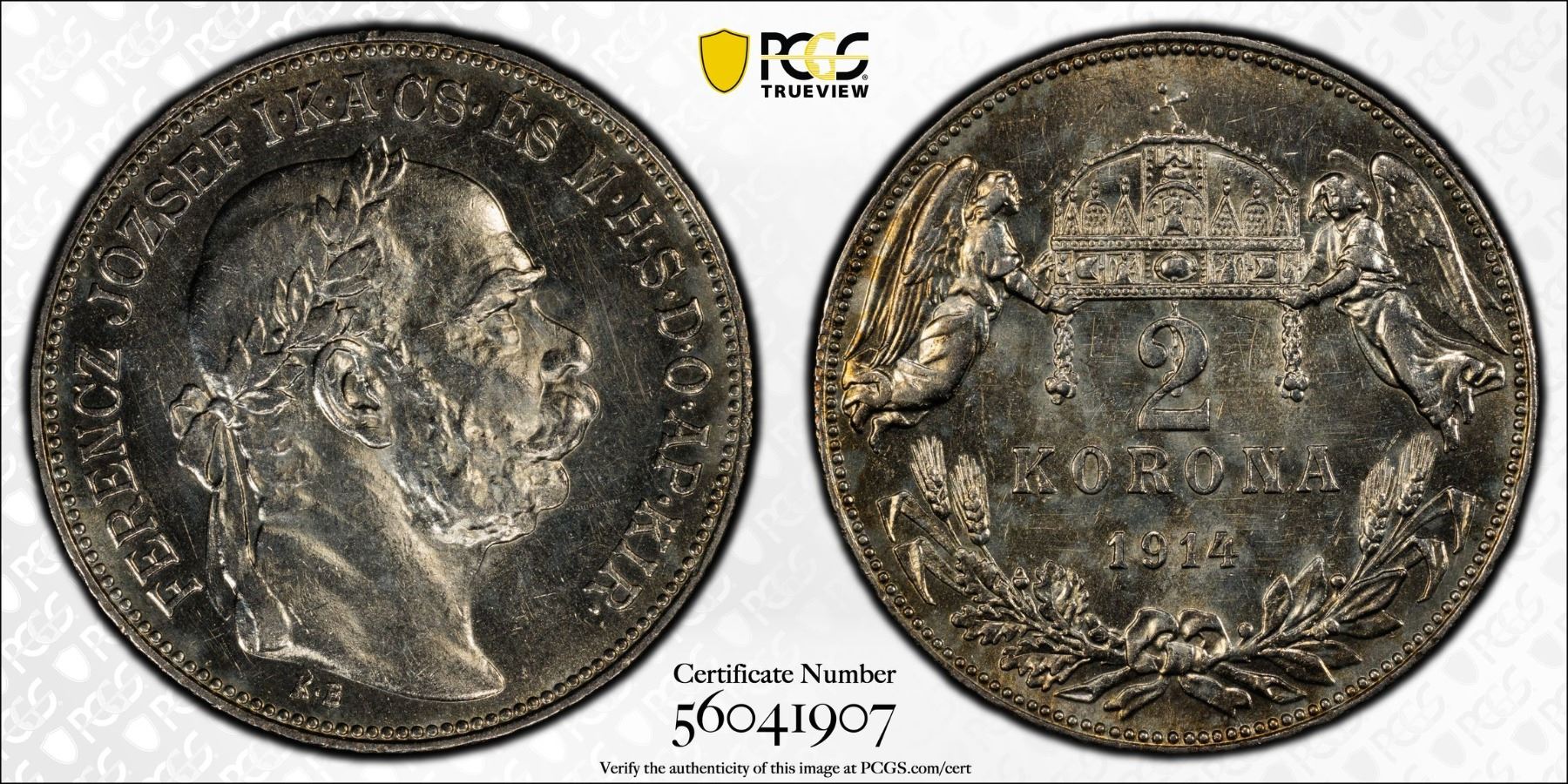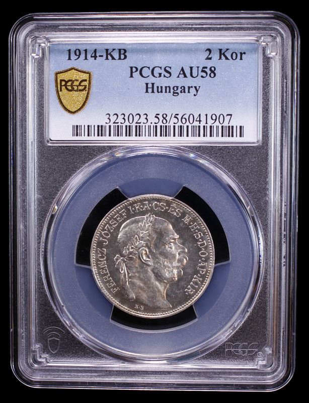 HUNGARY: Franz Joseph I, 1848-1916, AR 2 korona, 1914, PCGS AU58