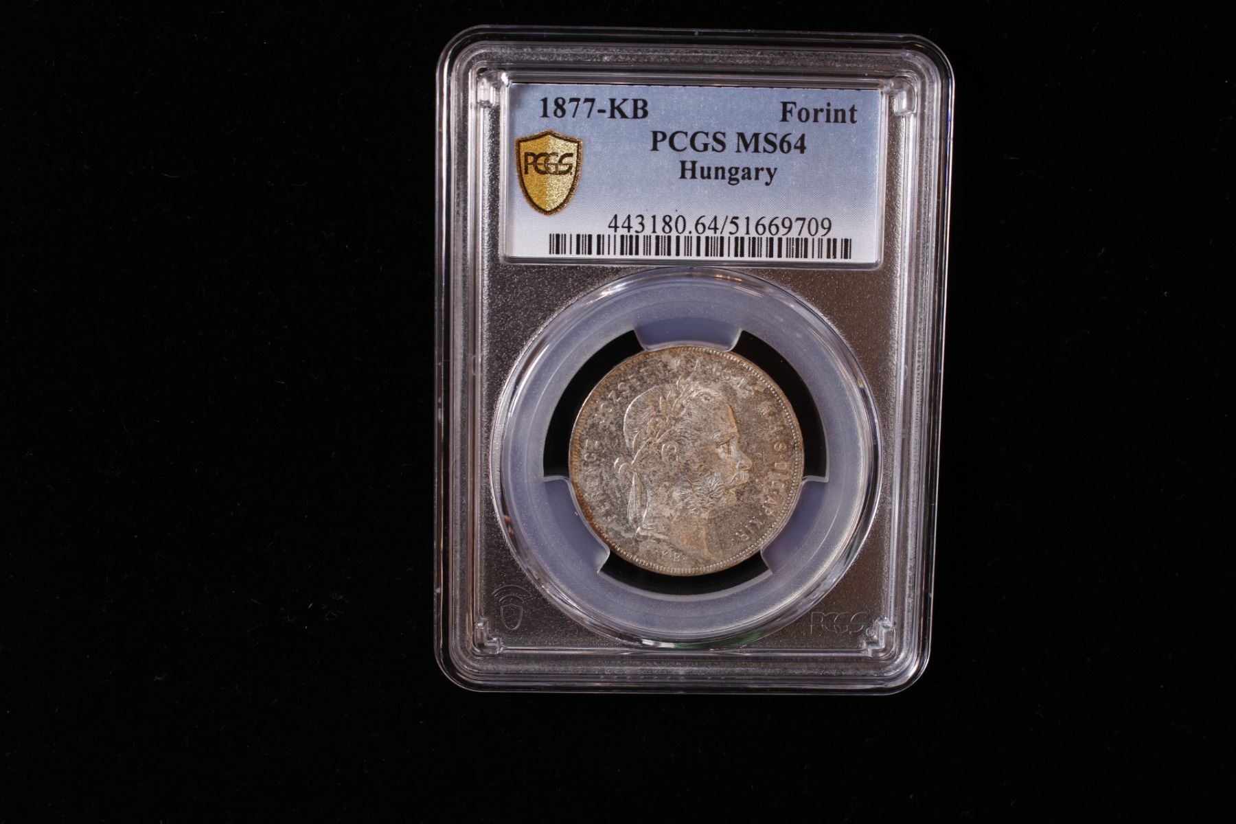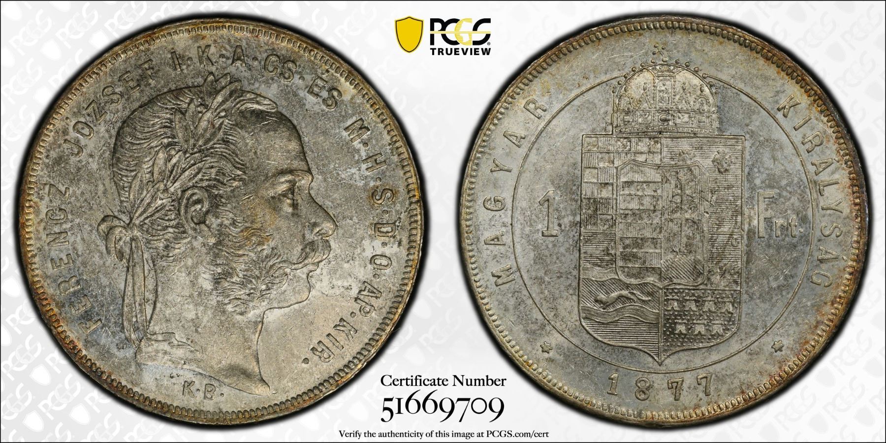 HUNGARY: Franz Joseph I, 1848-1916, AR forint, Kremnica, 1877-KB, PCGS MS64