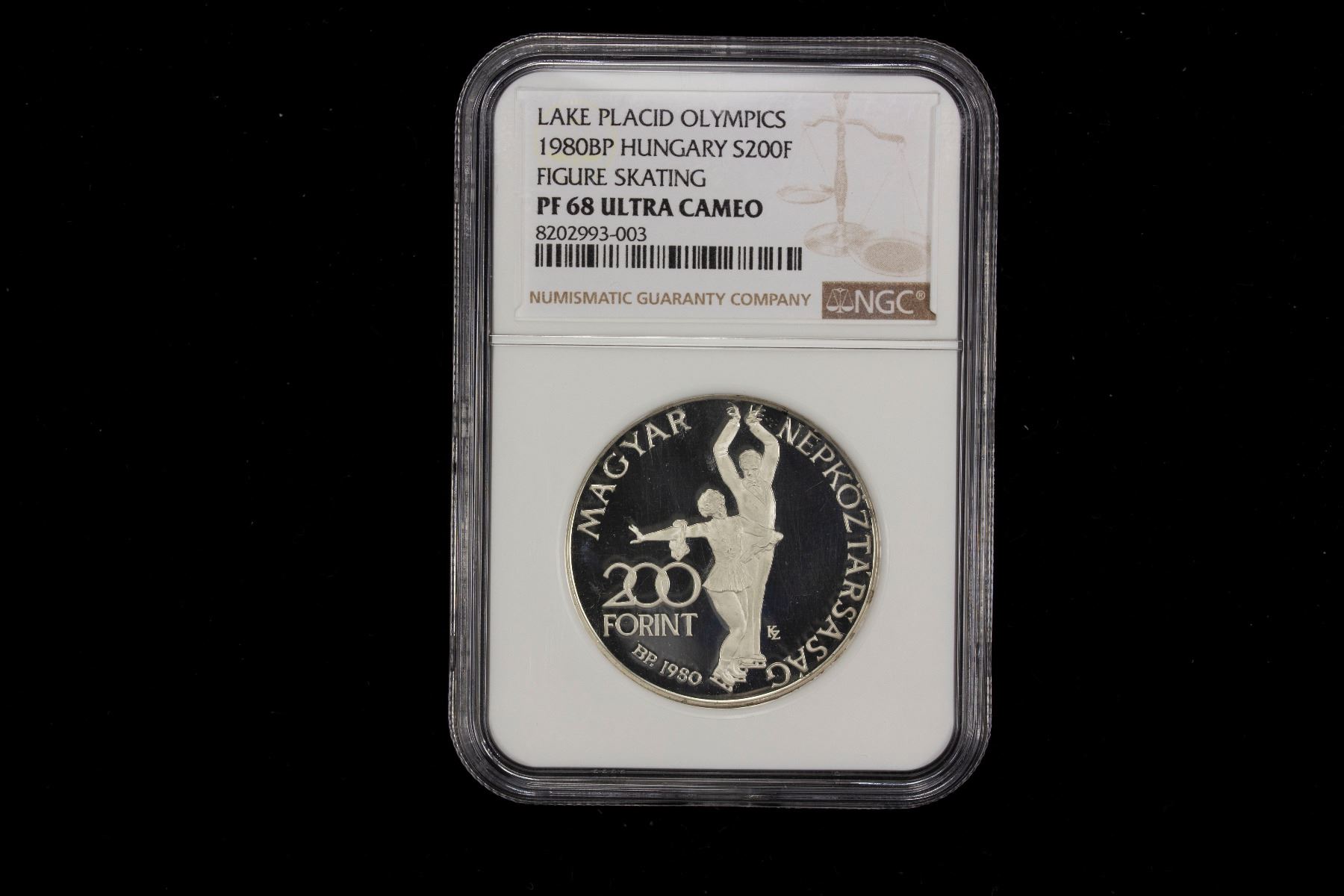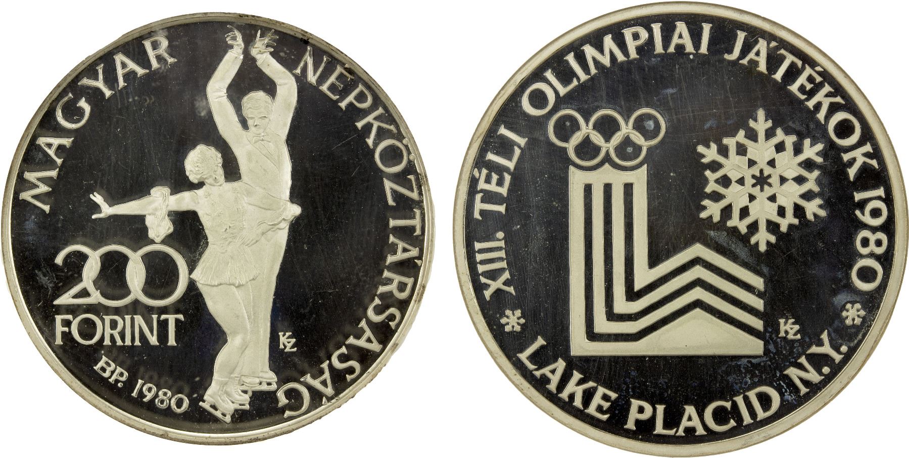 HUNGARY: People's Republic, AR 200 forint, Budapest, 1980-BP, KM-618, XIII Winter Olympics-Lake Placid, Figure Skaters, NGC graded Proof 68 Ultra Cameo.