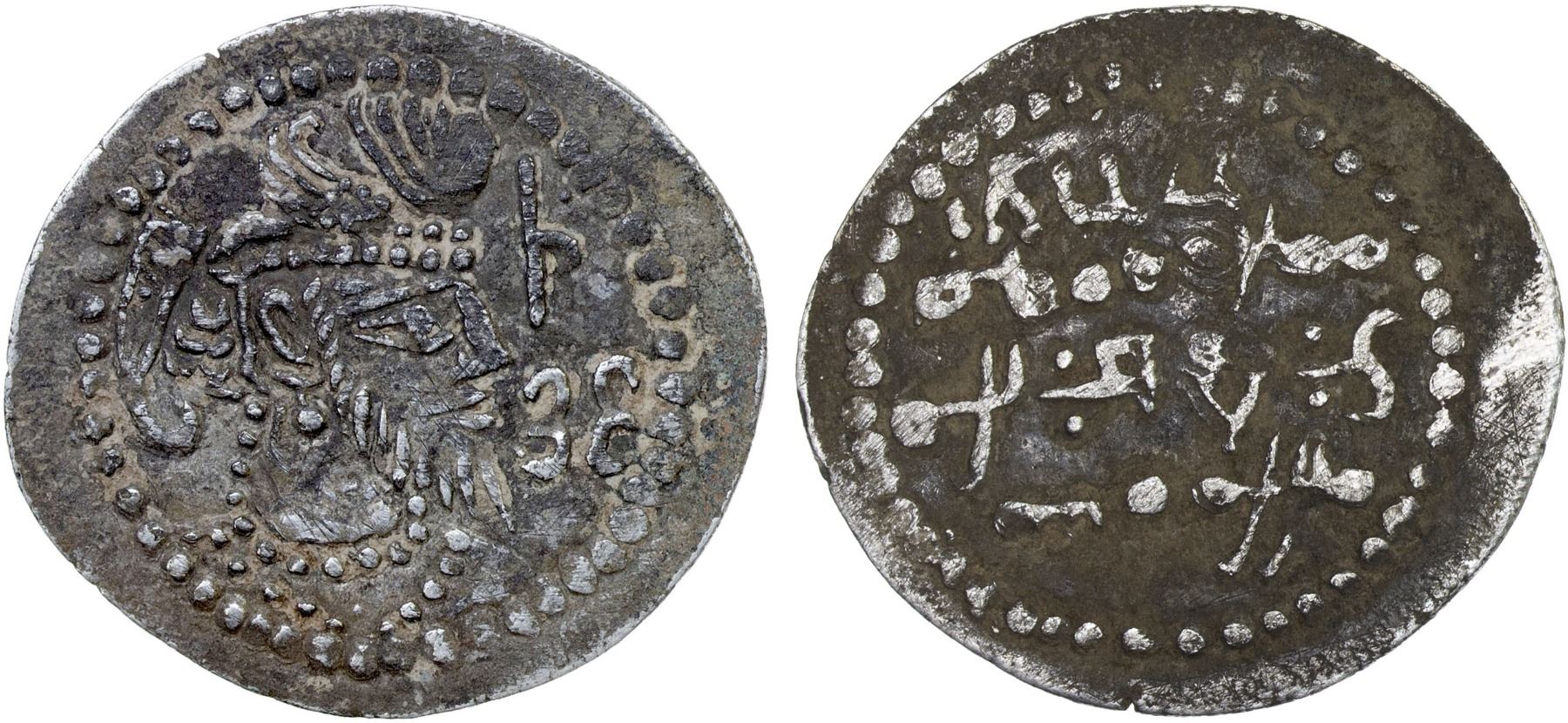 HUNNIC TRIBES: Anonymous, dates unknown, AR unit (2.65g), Zeno-352326 (this piece), see also Zeno-279809 for further information, bearded bust right, wearing winged crown with korymbos, symbol (sometimes identified as ankus) and tamgha to right // three-line Bactrian legend, with 3 additional symbols below; one of two known examples (the other is Zeno-279809 that weighs only 1.33g), VF, RRRR. Nicholas Sims-Williams has suggested (on Zeno-279809) that this example should be classified under the Western Turk Yabghus and may include a name like Vasu or Uvasu for the ruler. He has also suggested should be numerals for the date of 494 in the Bactrian era, which would be approximately 716 AD, but that is very tentative.