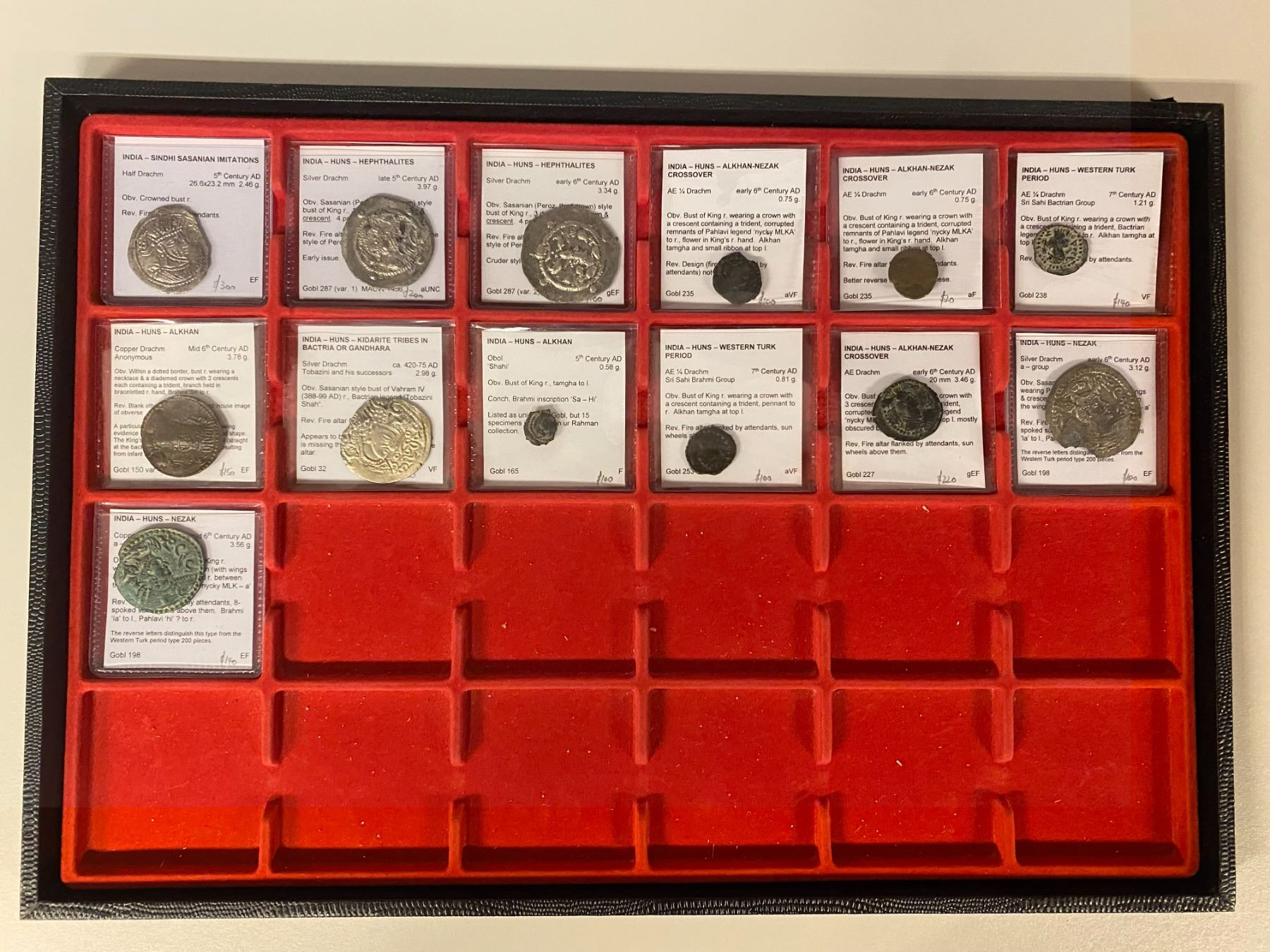 HUNNIC TRIBES: LOT of 4 silver, 2 billon, 7 copper coins, by Göbl numbers: G-32 (AR, Tobazini style, VF but chipped and some corrosion near the edge); G-150 (AE, king's head rght, holding branch, choice VF); G-165 (AE "obol", 0.58g, king's bust, Fine, crude strike); G-198 (BI drachm, Nezak type, both VF-EF but both chipped); G-227 (AE drachm, king with 3-unit crown, VF-EF); G-235 (AE, bust right, F-VF, tiny chip); G-236 (AE, bust right, Good); B-238 (AE, bust right // fire altar, choice VF); G-253 (bust right // fire altar & attendants, F-VF); G-287 (Hephthalite, AR drachm, 2 varieties, both EF, but one with light reverse porosity); and Indo-Sasanian (AR drachm, derived from Shahpur II, VF-EF but badly chipped); retail value $600, lot of 13 pieces, ex Ian Todd Collection.