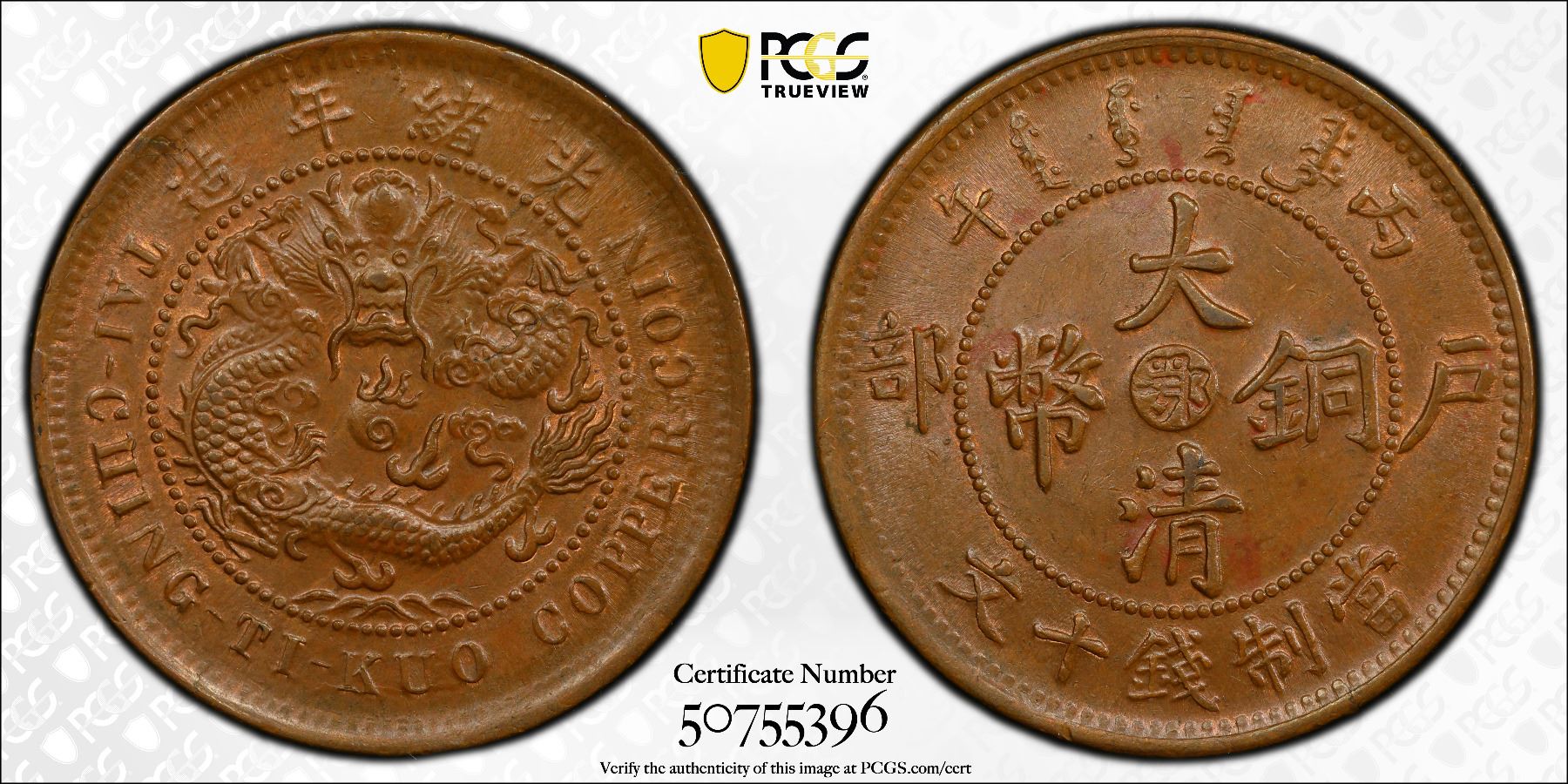 HUPEH: Kuang Hsu, 1875-1908, AE 10 cash, CD1906, PCGS MS64 BN