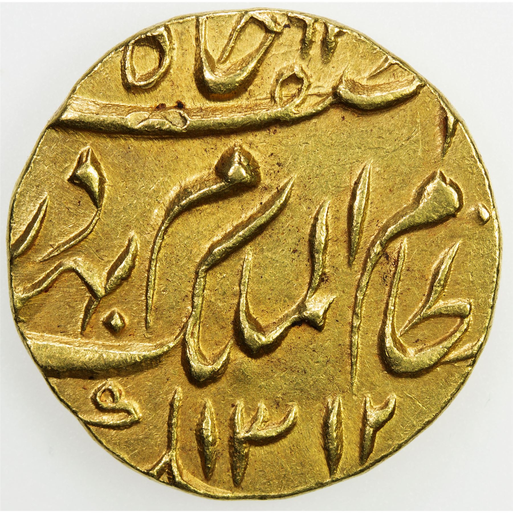 HYDERABAD: Mir Mahbub Ali Khan, 1869-1911, AV ashrafi (11.17g), Farkhanda Bunyad Hyderabad, AH1312 year (2)8, Y-22, bold strike, one small testmark, some original luster, AU.