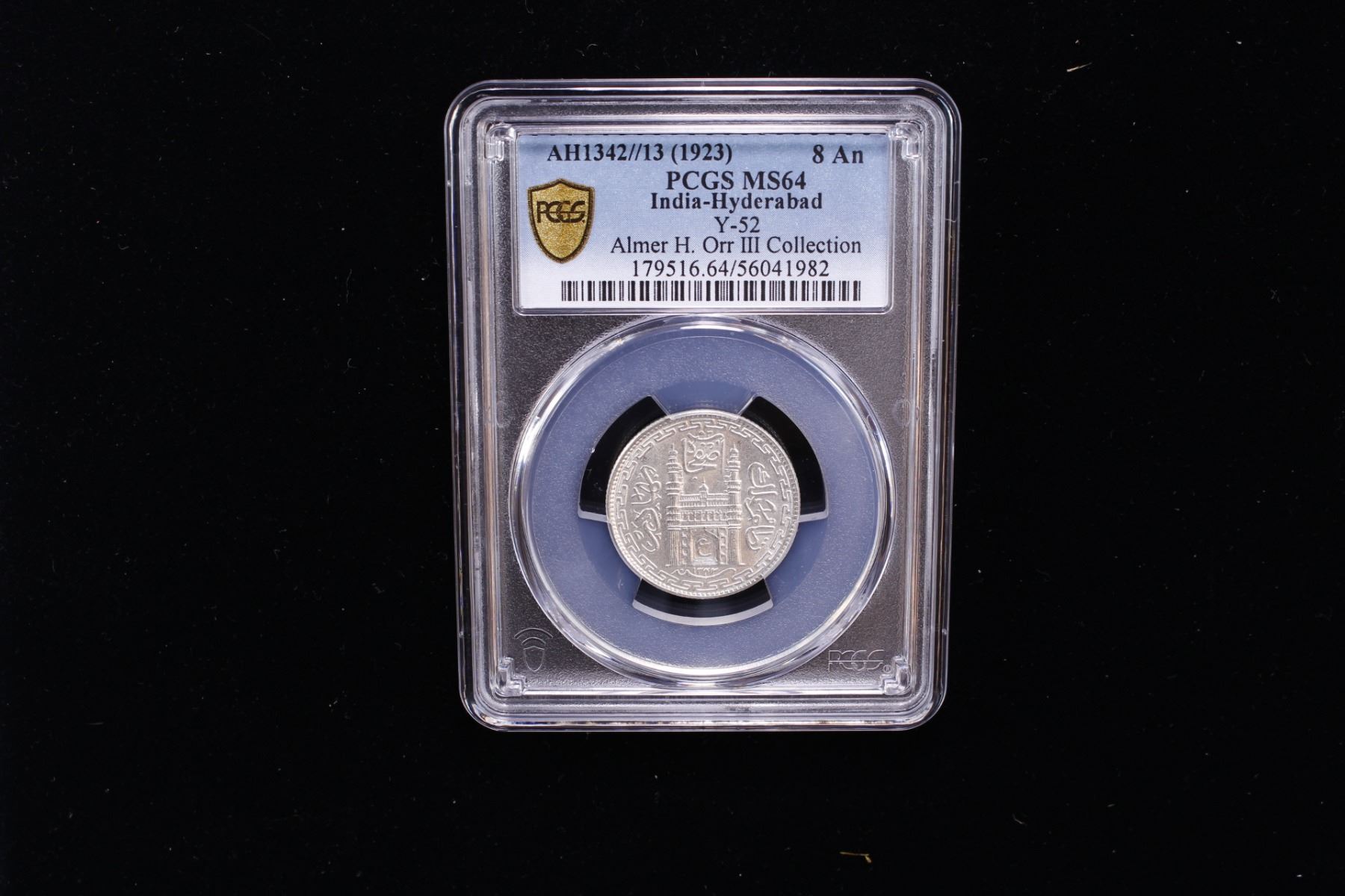 HYDERABAD: Mir Usman Ali Khan, 1911-1948, AR 8 annas (1/2 rupee), AH1342 year 13, Y-52, blast white luster, better type, PCGS graded MS64, ex Almer H. Orr III Collection.