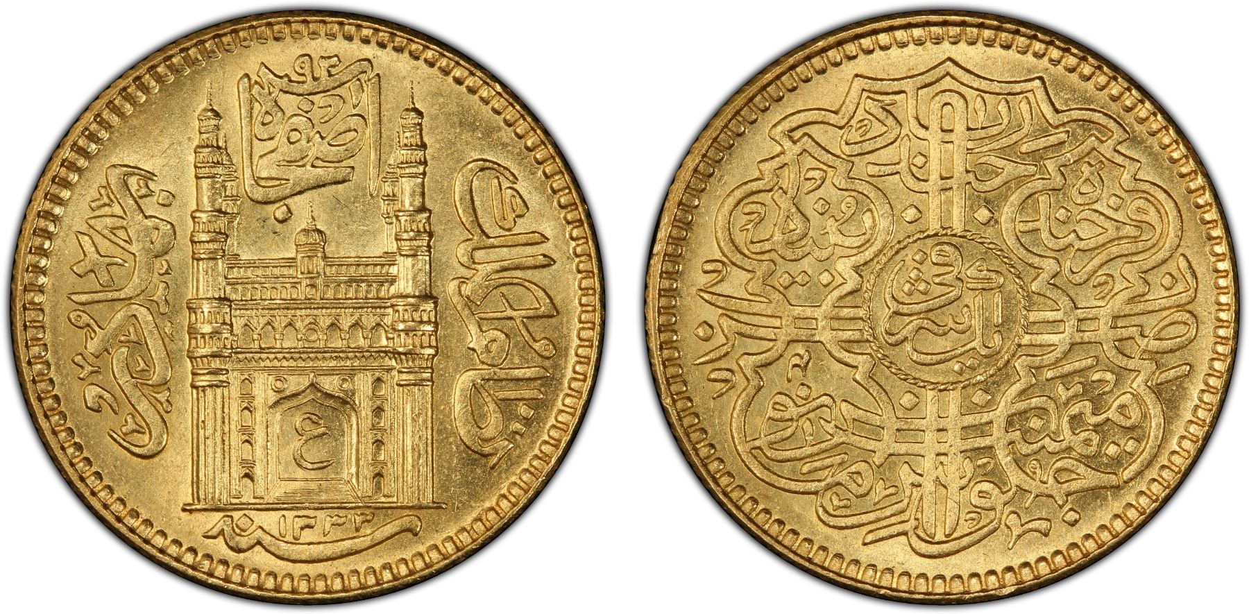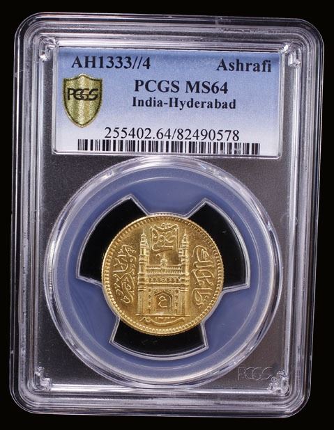 HYDERABAD: Mir Usman Ali Khan, 1911-1948, AV ashrafi, AH1333 year 4, Y-57a. Fr-1165, spectacular luster, boldly struck, PCGS graded MS64, ex The 1914 Collection. Second finest graded by PCGS.