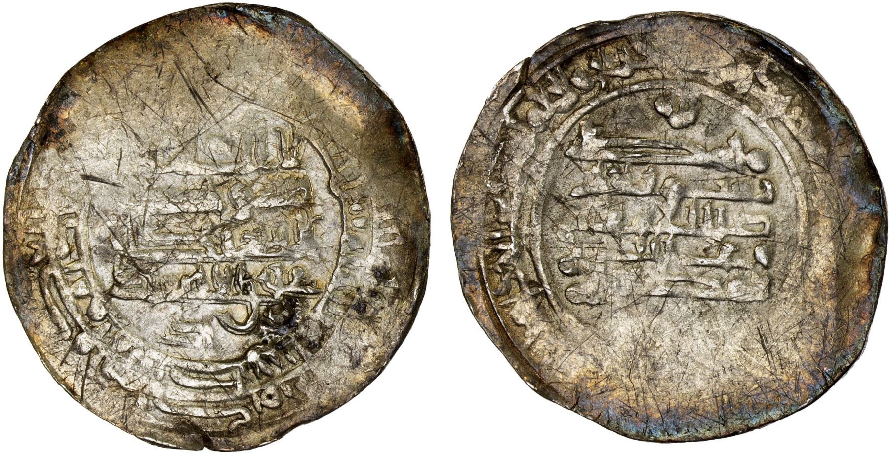 IKHSHIDID: 'Ali b. al-Ikhshid, 961-966, AR dirham (3.65g), Filastin, AH353, A-679, with K below obverse field, for Kafur, who served as chamberlain under both Abu'l-Qasim and 'Ali, and later became Ikhshidid king, AH355-357 (966-968 AD), some weakness as virtually always, some very light scratches, decent strike, crude VF.