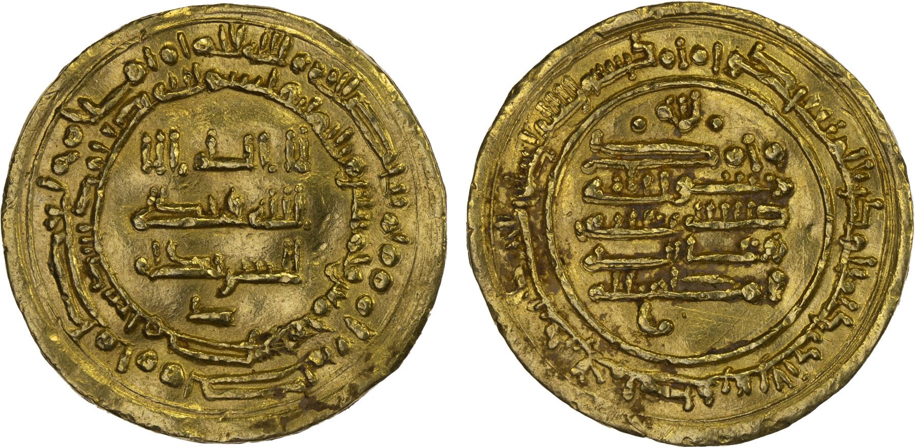 IKHSHIDID: Kafur, 966-968, AV dinar (4.87g), Misr, AH355, A-680.1, citing the ruler only by the first letter of his name, kaf, below the obverse field, slightly uneven surfaces, XF, R. Abu'l-Misk Kafur was a Black African slave purchased from Ethiopia by Abb'l-Qasim. He rose through the ranks, eventually becoming regent to the young 'Ali. He became sole ruler upon 'Ali's death in 355/966.