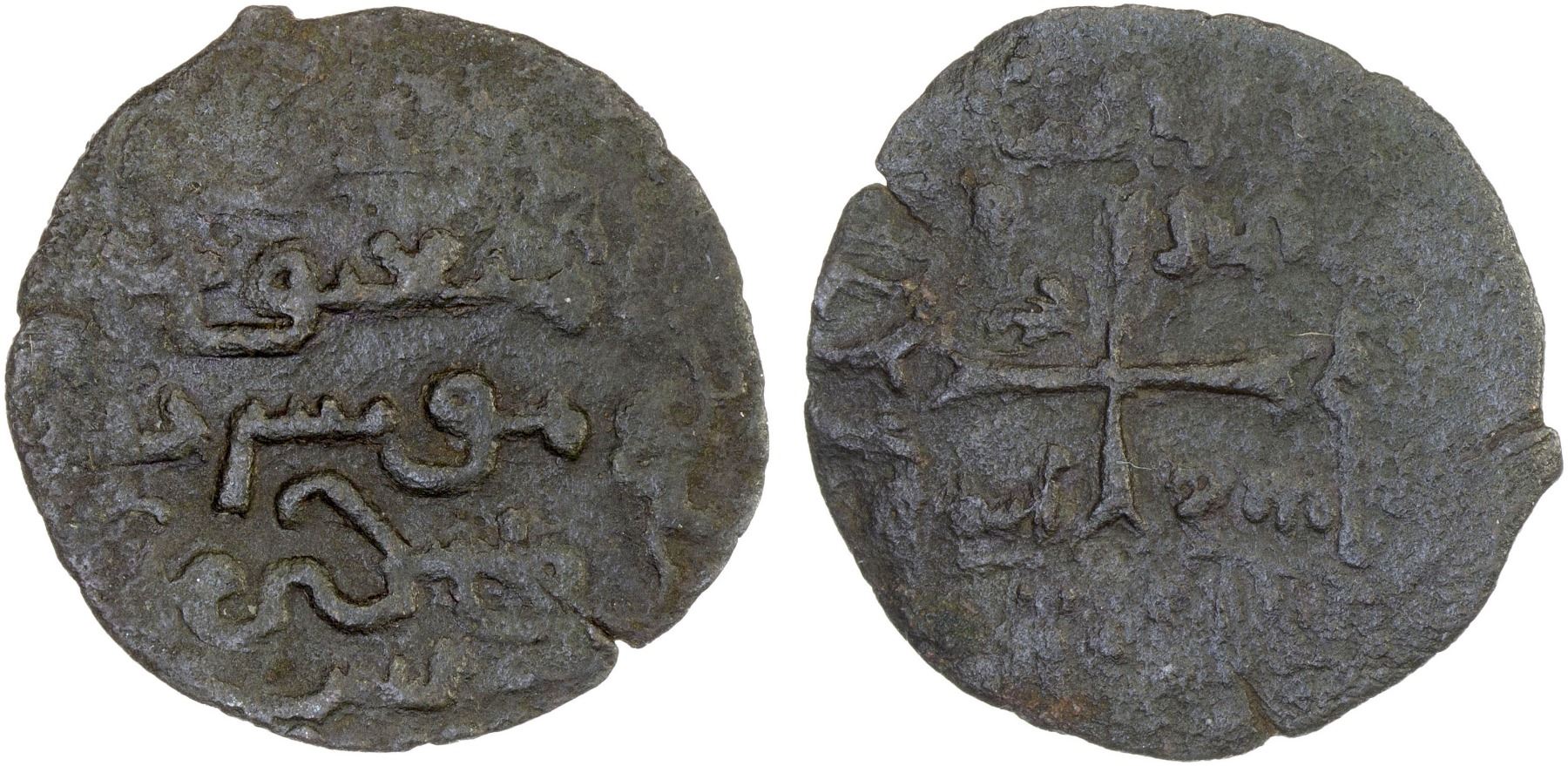 ILKHAN: Abaqa, 1265-1282, AE fals (2.67g), NM, ND, A-2131G, Bennett-359, trilingual: Uighur text citing Abaqa // large cross in center with Armenian text meaning "Lord God, Jesus Christ" in the center, Arabic for "in the name of the Father, the Son, and the Holy Spirit, one God"; crude strike as always; porous surfaces, Fine, RR. Despite the Armenian text, the type is never found in Armenia, normally in the area of Dmanisi in Georgia.