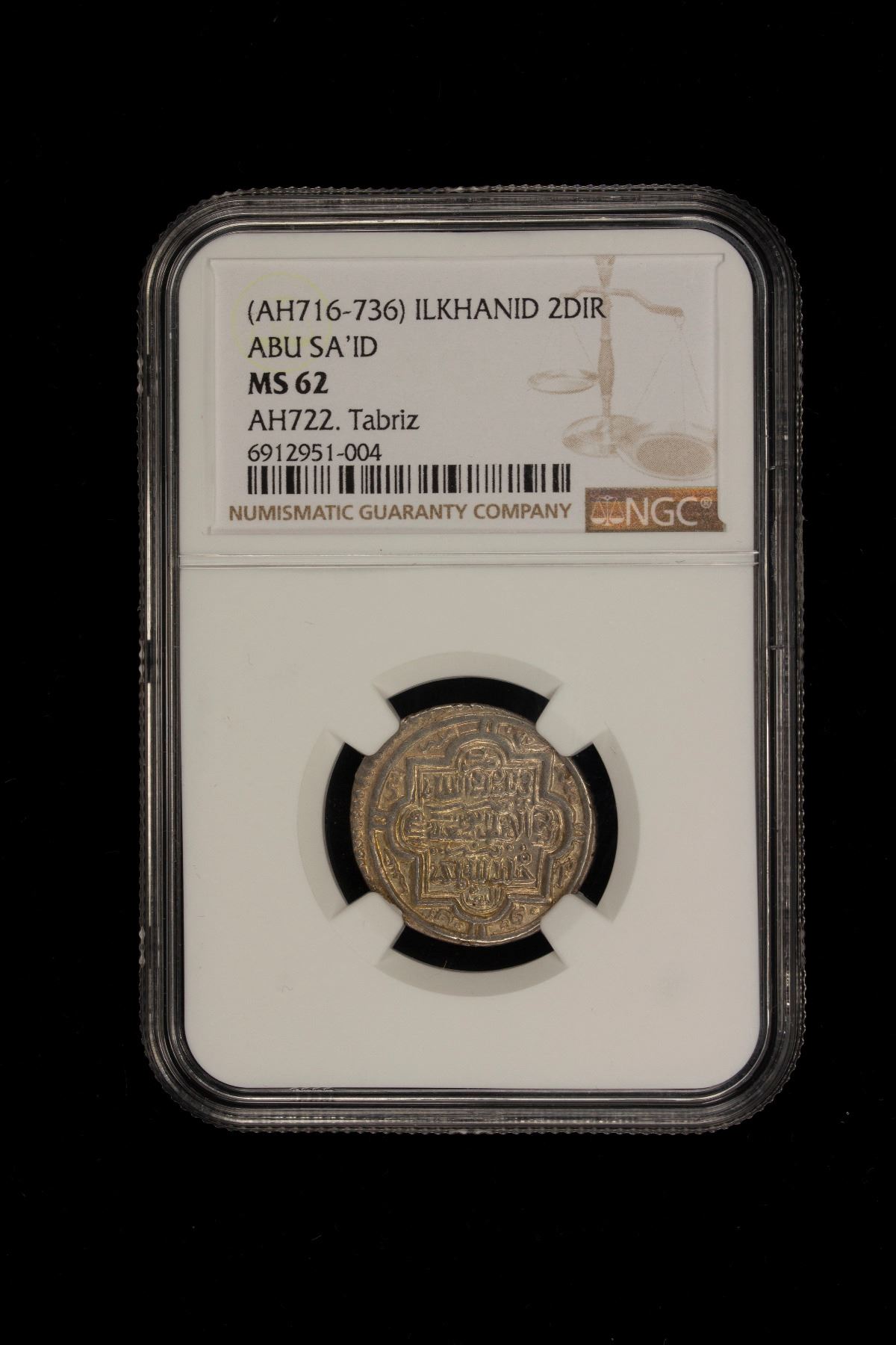 ILKHAN: Abu Sa'id, 1316-1335, AR 2 dirhams, Tabriz, AH722, A-2200.2, magnificent strike, without any weakness whatsoever, NGC graded MS62.