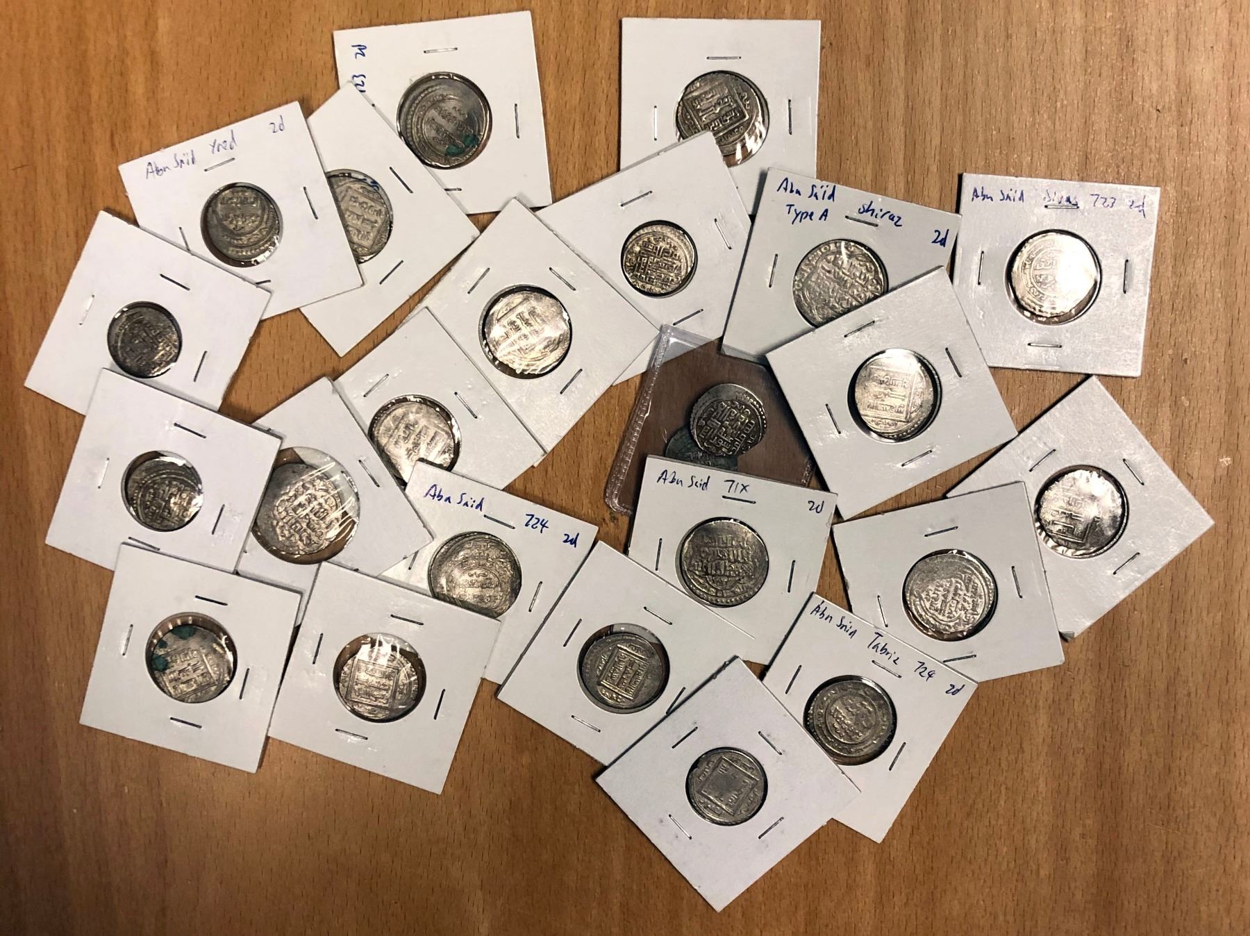 ILKHAN: Abu Sa 'id, 1316-1335, LOT of 50 silver double dirhams of Abu Sa 'id of different types from a variety of mints, including Abu Ishaq, Akhlat, Astarabad, Baghdad, Bayburt, Bazar, Isfahan, Isfarayin, Jurjan, Kashan, Kirman, Lahijan, Pol-i Aras, Saveh, Shiraz, Shushtar, Sivas, Sultaniya, Tabriz, Wasit, Yazd, Zaydan; average circulated conditions, most with legible mint, many with legible date, a great study group! retail value $750, lot of 50 pieces.