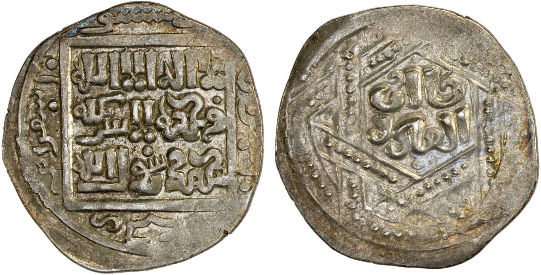ILKHAN: Anonymous Qa'an al-'Adil, AR dirham (2.70g), Isfarayin, ND, A-2136, qa'an al-'adil in hexagram, long kalima on reverse, kaan in Uighur in top segment of reverse margin, pleasing VF-XF, ex Ruud Schüttenhelm collection.