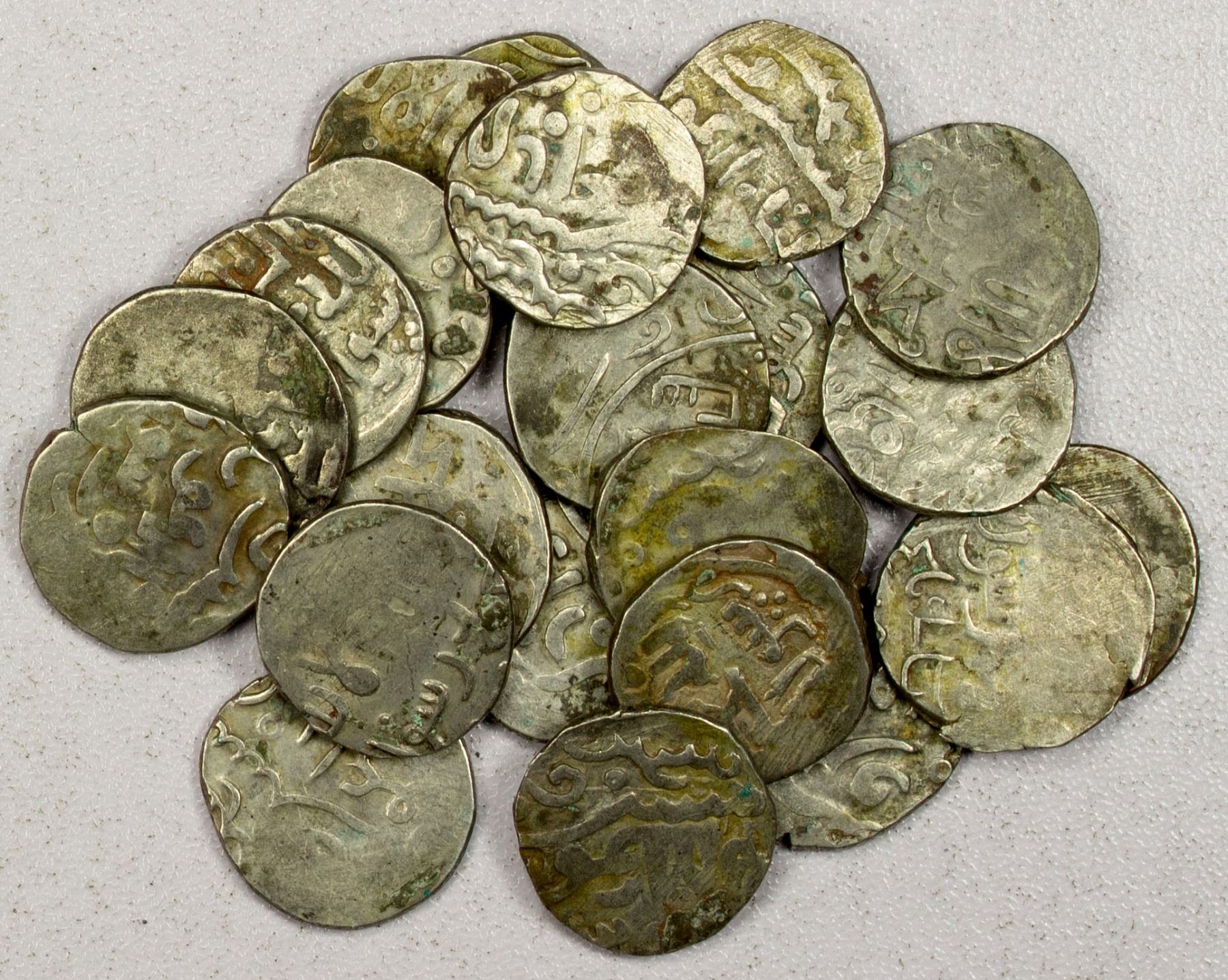 ILKHAN: Arghun, 1284-1291, LOT of 22 silver coins, A-2156R, all have the name Arghun and a mint name in Arabic, plus the kalima on the reverse; a few show a mint, either Herat or Sharfurqan; formerly unknown but a hoard of at least 200 pieces has now been found and marketed; average Fine condition, a few nicer, but all with some weakness; retail value $550, lot of 22 pieces.