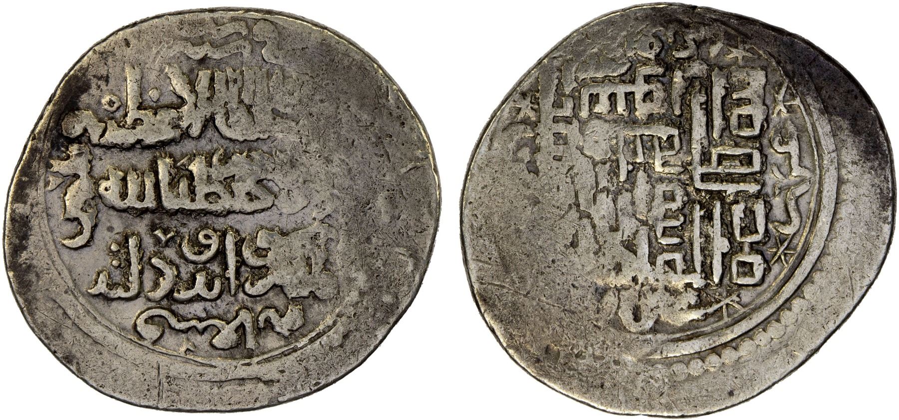 ILKHAN: Arpa Ga'un, 1335-1336, AR 2 dirhams (2.83g), AH736, A-2221, same reverse as type H of Abu Sa'id, with spiraled kalima in Kufic script; clear date; about 15% flat strike, F-VF, RR.