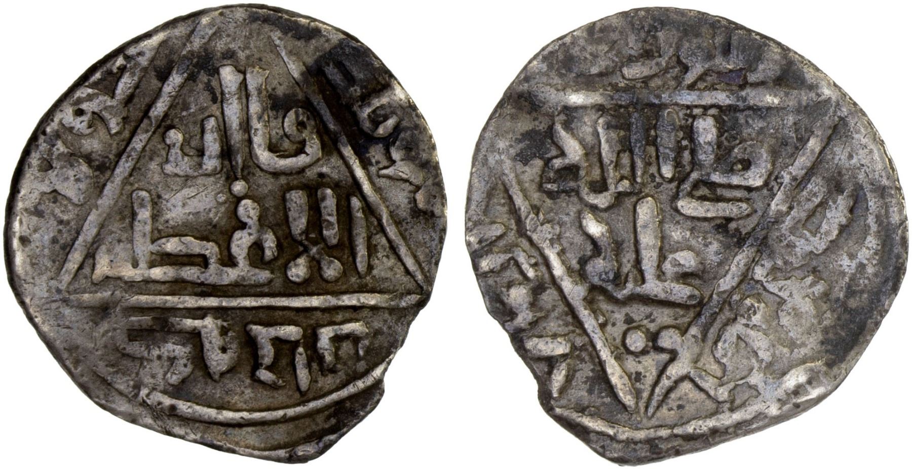 ILKHAN: Hulagu, 1256-1265, AR 1/3 dirham (0.95g), NM, ND, A-2123A, central triangle both sides, stylistically identical to type A-277A of the last Abbasid caliph al-Musta'sim, but with the name of Hulagu instead, presumably struck only at Madinat al-Salam, mount removed, F-VF, RRR.