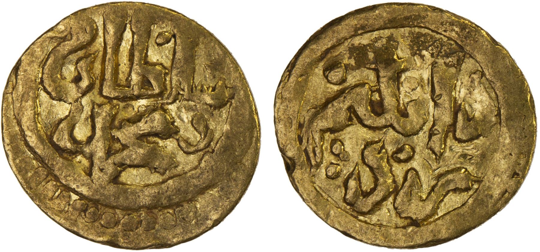 ILKHAN: Muhammad Khan, 1336-1338, AV 1/4 dinar (1.09g), Yazd, ND, A-T2226, short inscriptions sultan / muhammad // danakim / yazd, where danakim means ¼, indicating that this coin is indeed a quarter of a mithqal in the Ilkhan period (ca. 4.32g), bold VF. Fourth known example, first sold by Sotheby's in 1984, then two on Zeno (both sold in our auctions 37 & 48).