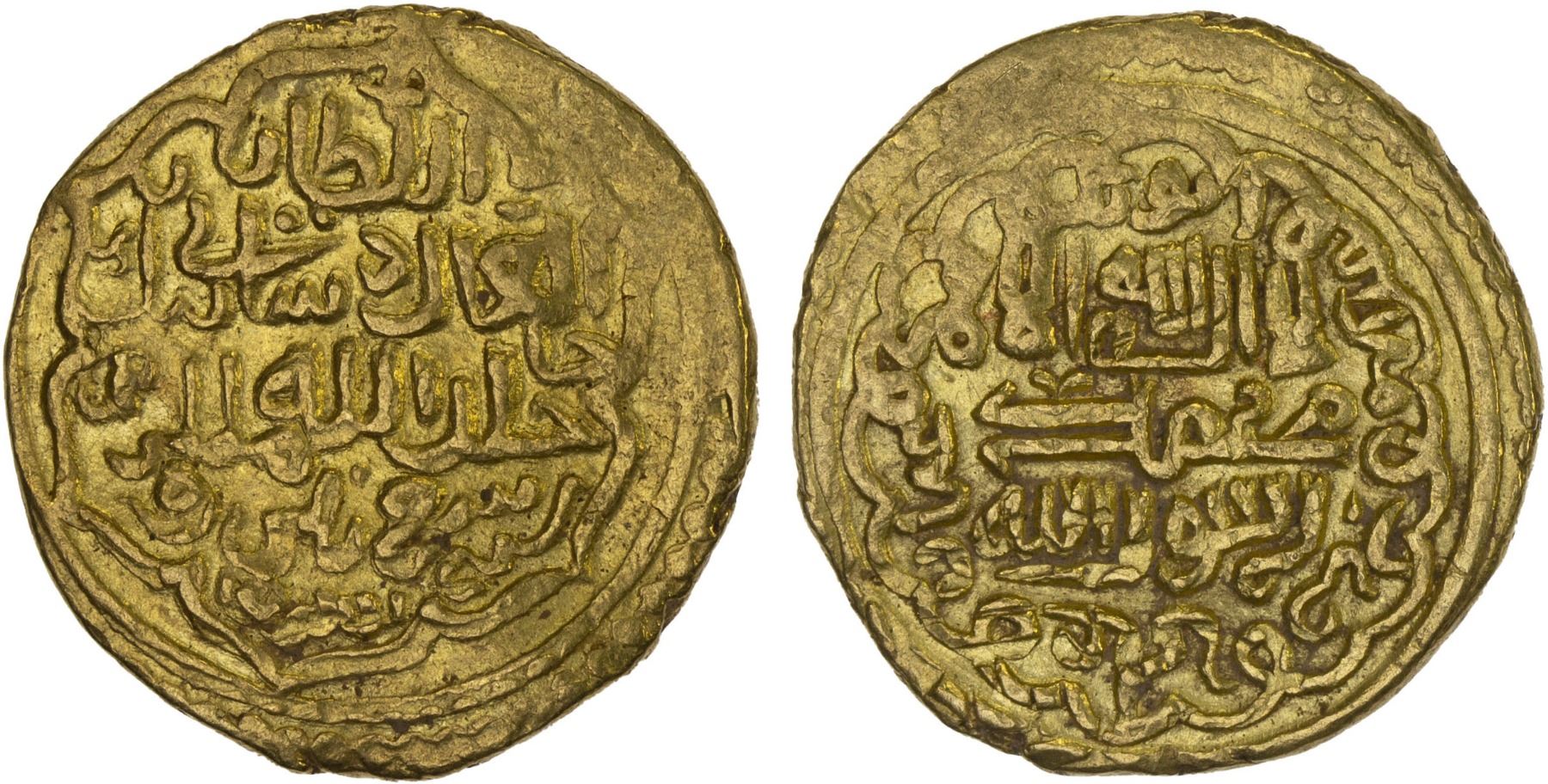 ILKHAN: Sati Beg, 1338-1339, AV dinar (4.33g), Hamadan, AH739, A-K2231, Diler-Sa723, based on Sati Beg's type HA, as on double dirhams of Hamadan 739; this appears to be the second known example in gold, VF, RRRR. Only one example of CoinArchives, sold in Islamic Coin Auction 20, lot 735 (= Zeno-37160).