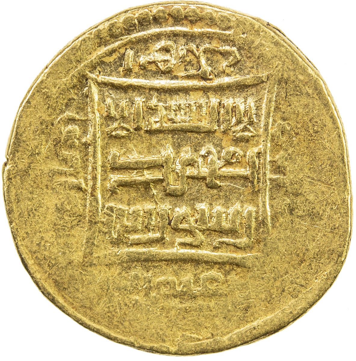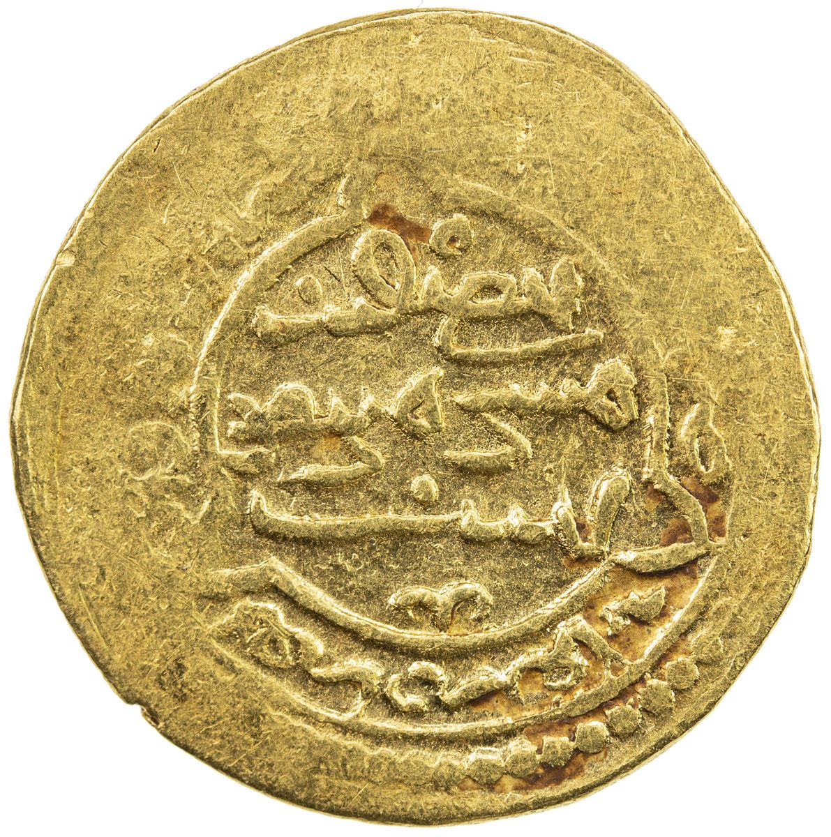 ILKHAN: Taghay Timur, 1336-1353, AV dinar (3.43g), MM, AH744, A-L2233var, type IC (circle notched at three equidistant points // plain square), probably minted only at Baghdad, about 25% flat strike, possibly unique, VF to EF, RRR, ex Christian Rasmussen Collection. No gold coins of type IC are posted on Zeno or CoinArchives.